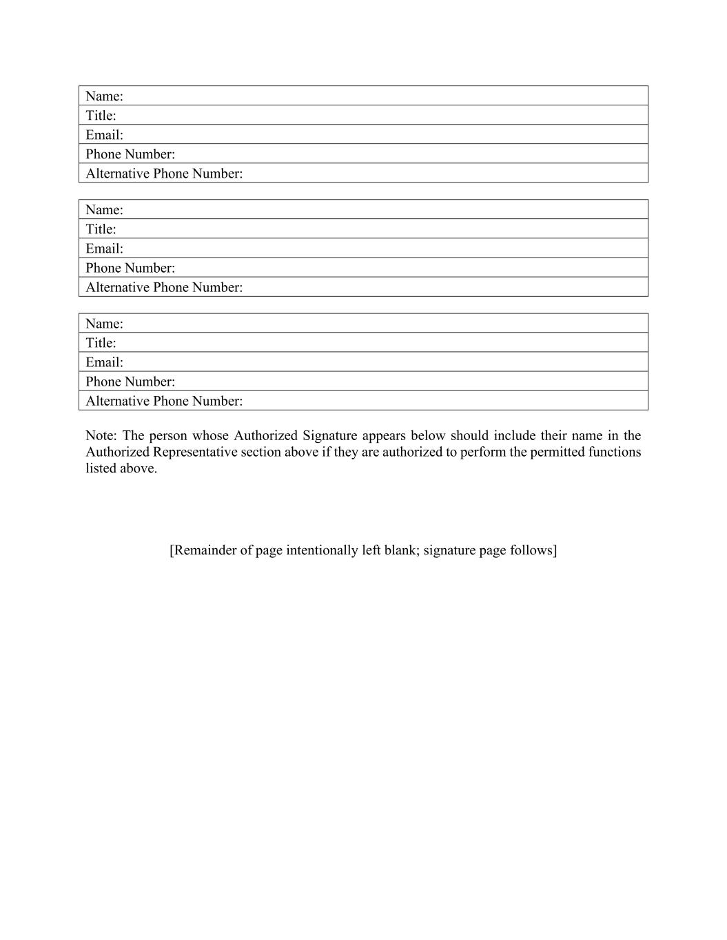 Name: Title: Email: Phone Number: Alternative Phone Number: Name: Title: Email: Phone Number: Alternative Phone Number: Name: Title: Email: Phone Number: Alternative Phone Number: Note: The person whose Authorized Signature appears below should include their name in the Authorized Representative section above if they are authorized to perform the permitted functions listed above. [Remainder of page intentionally left blank; signature page follows]
