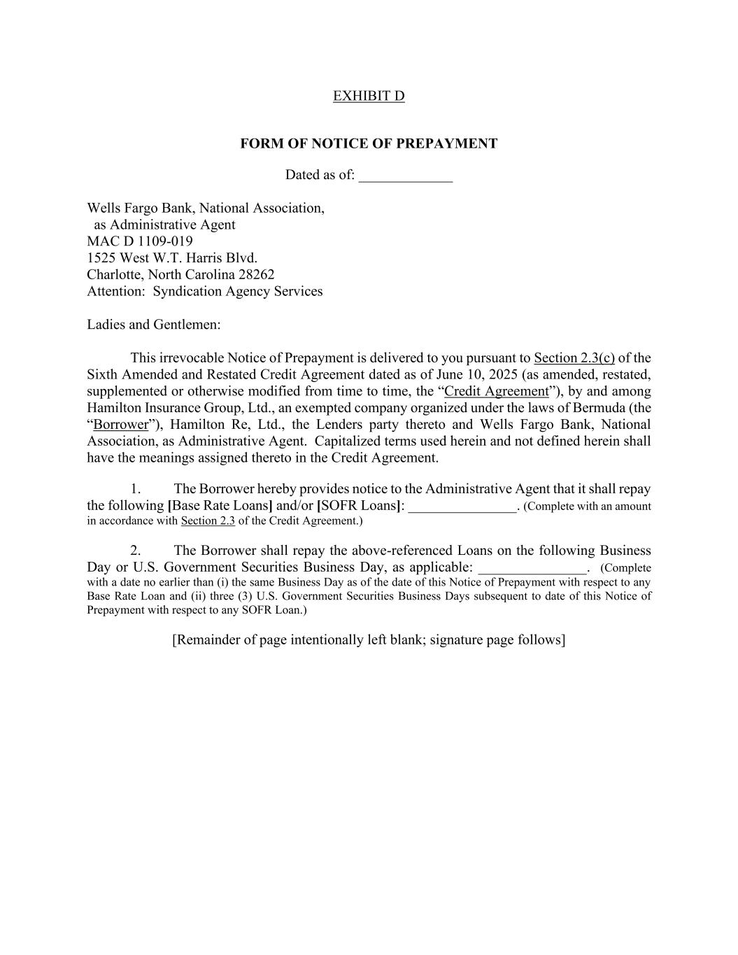 EXHIBIT D FORM OF NOTICE OF PREPAYMENT Dated as of: _____________ Wells Fargo Bank, National Association, as Administrative Agent MAC D 1109-019 1525 West W.T. Harris Blvd. Charlotte, North Carolina 28262 Attention: Syndication Agency Services Ladies and Gentlemen: This irrevocable Notice of Prepayment is delivered to you pursuant to Section 2.3(c) of the Sixth Amended and Restated Credit Agreement dated as of June 10, 2025 (as amended, restated, supplemented or otherwise modified from time to time, the “Credit Agreement”), by and among Hamilton Insurance Group, Ltd., an exempted company organized under the laws of Bermuda (the “Borrower”), Hamilton Re, Ltd., the Lenders party thereto and Wells Fargo Bank, National Association, as Administrative Agent. Capitalized terms used herein and not defined herein shall have the meanings assigned thereto in the Credit Agreement. 1. The Borrower hereby provides notice to the Administrative Agent that it shall repay the following [Base Rate Loans] and/or [SOFR Loans]: _______________. (Complete with an amount in accordance with Section 2.3 of the Credit Agreement.) 2. The Borrower shall repay the above-referenced Loans on the following Business Day or U.S. Government Securities Business Day, as applicable: _______________. (Complete with a date no earlier than (i) the same Business Day as of the date of this Notice of Prepayment with respect to any Base Rate Loan and (ii) three (3) U.S. Government Securities Business Days subsequent to date of this Notice of Prepayment with respect to any SOFR Loan.) [Remainder of page intentionally left blank; signature page follows]
