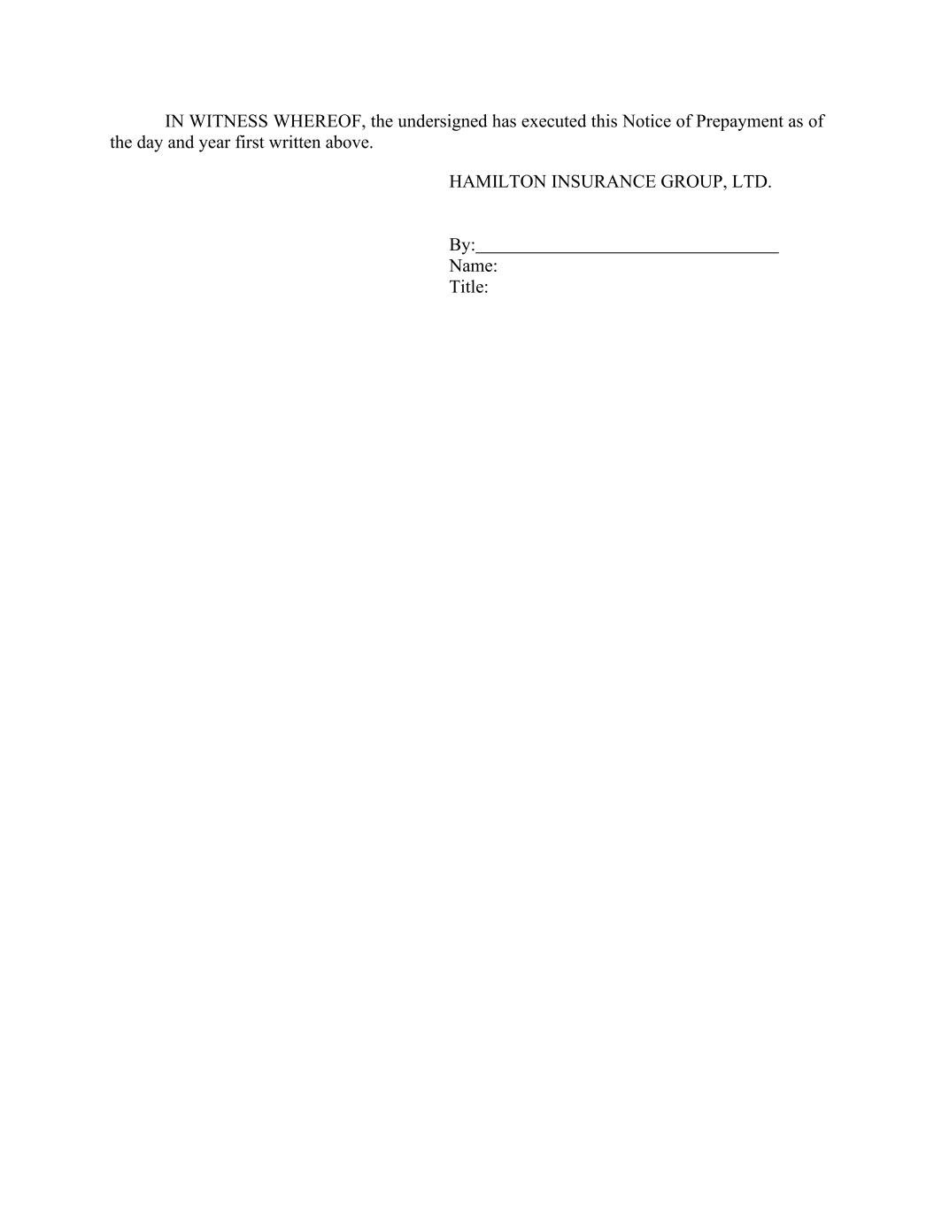 IN WITNESS WHEREOF, the undersigned has executed this Notice of Prepayment as of the day and year first written above. HAMILTON INSURANCE GROUP, LTD. By: Name: Title: