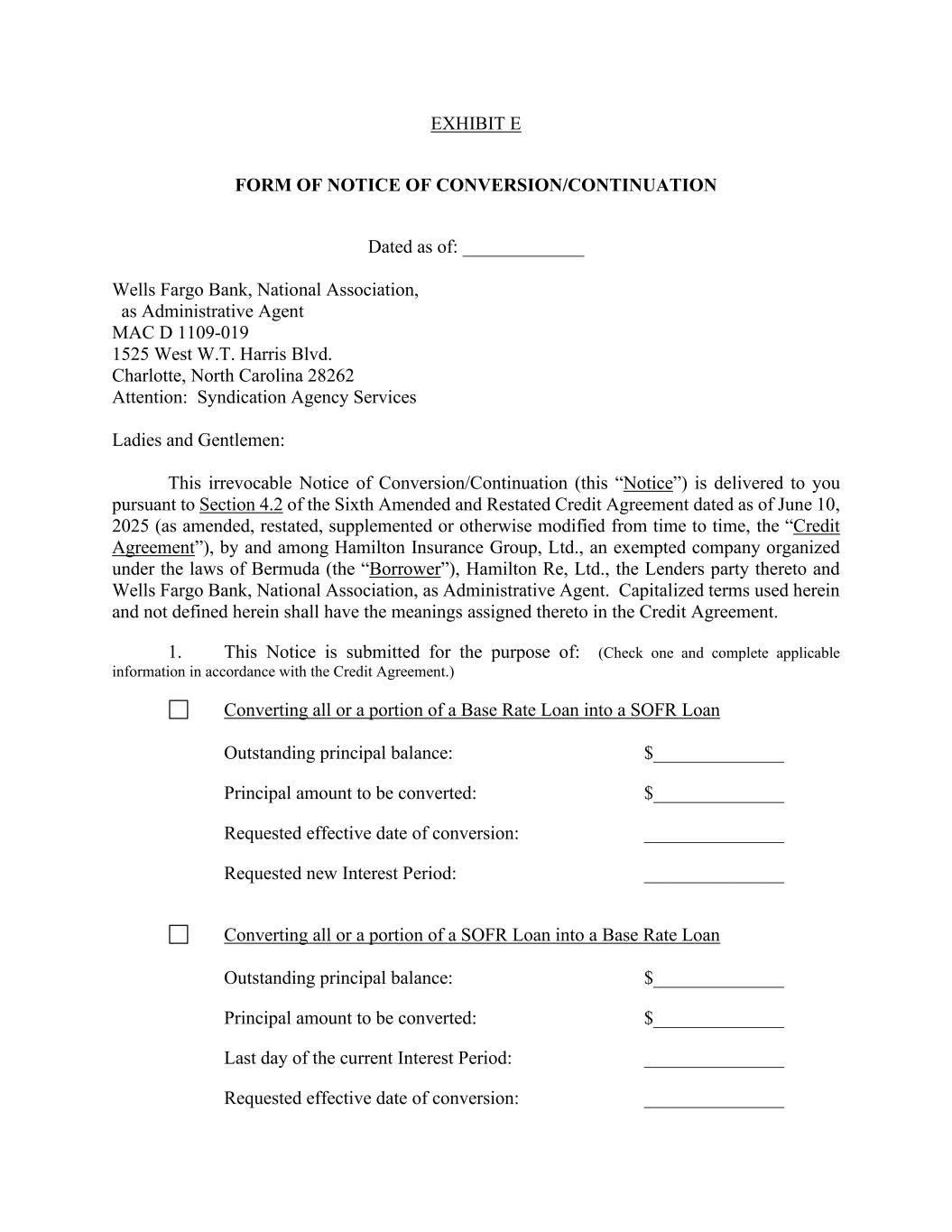 EXHIBIT E FORM OF NOTICE OF CONVERSION/CONTINUATION Dated as of: _____________ Wells Fargo Bank, National Association, as Administrative Agent MAC D 1109-019 1525 West W.T. Harris Blvd. Charlotte, North Carolina 28262 Attention: Syndication Agency Services Ladies and Gentlemen: This irrevocable Notice of Conversion/Continuation (this “Notice”) is delivered to you pursuant to Section 4.2 of the Sixth Amended and Restated Credit Agreement dated as of June 10, 2025 (as amended, restated, supplemented or otherwise modified from time to time, the “Credit Agreement”), by and among Hamilton Insurance Group, Ltd., an exempted company organized under the laws of Bermuda (the “Borrower”), Hamilton Re, Ltd., the Lenders party thereto and Wells Fargo Bank, National Association, as Administrative Agent. Capitalized terms used herein and not defined herein shall have the meanings assigned thereto in the Credit Agreement. 1. This Notice is submitted for the purpose of: (Check one and complete applicable information in accordance with the Credit Agreement.) Converting all or a portion of a Base Rate Loan into a SOFR Loan Outstanding principal balance: $______________ Principal amount to be converted: $______________ Requested effective date of conversion: _______________ Requested new Interest Period: _______________ Converting all or a portion of a SOFR Loan into a Base Rate Loan Outstanding principal balance: $______________ Principal amount to be converted: $______________ Last day of the current Interest Period: _______________ Requested effective date of conversion: _______________