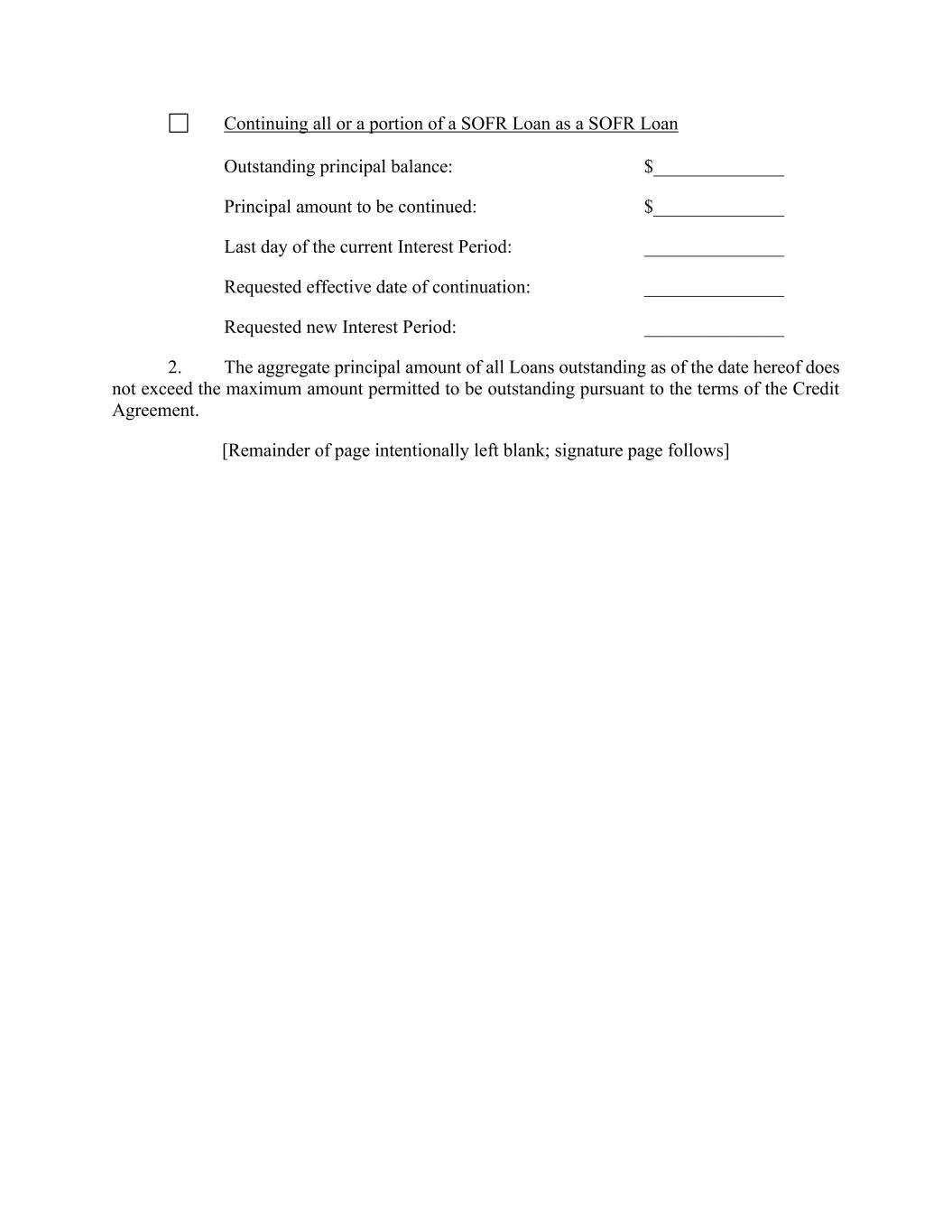 Continuing all or a portion of a SOFR Loan as a SOFR Loan Outstanding principal balance: $______________ Principal amount to be continued: $______________ Last day of the current Interest Period: _______________ Requested effective date of continuation: _______________ Requested new Interest Period: _______________ 2. The aggregate principal amount of all Loans outstanding as of the date hereof does not exceed the maximum amount permitted to be outstanding pursuant to the terms of the Credit Agreement. [Remainder of page intentionally left blank; signature page follows]