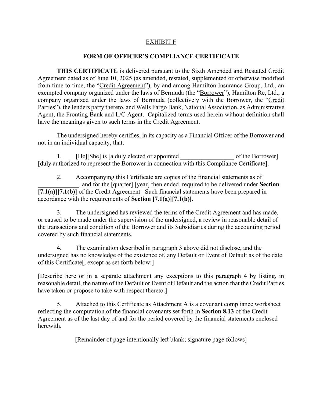 EXHIBIT F FORM OF OFFICER’S COMPLIANCE CERTIFICATE THIS CERTIFICATE is delivered pursuant to the Sixth Amended and Restated Credit Agreement dated as of June 10, 2025 (as amended, restated, supplemented or otherwise modified from time to time, the “Credit Agreement”), by and among Hamilton Insurance Group, Ltd., an exempted company organized under the laws of Bermuda (the “Borrower”), Hamilton Re, Ltd., a company organized under the laws of Bermuda (collectively with the Borrower, the “Credit Parties”), the lenders party thereto, and Wells Fargo Bank, National Association, as Administrative Agent, the Fronting Bank and L/C Agent. Capitalized terms used herein without definition shall have the meanings given to such terms in the Credit Agreement. The undersigned hereby certifies, in its capacity as a Financial Officer of the Borrower and not in an individual capacity, that: 1. [He][She] is [a duly elected or appointed _________________ of the Borrower] [duly authorized to represent the Borrower in connection with this Compliance Certificate]. 2. Accompanying this Certificate are copies of the financial statements as of _____________, and for the [quarter] [year] then ended, required to be delivered under Section [7.1(a)][7.1(b)] of the Credit Agreement. Such financial statements have been prepared in accordance with the requirements of Section [7.1(a)][7.1(b)]. 3. The undersigned has reviewed the terms of the Credit Agreement and has made, or caused to be made under the supervision of the undersigned, a review in reasonable detail of the transactions and condition of the Borrower and its Subsidiaries during the accounting period covered by such financial statements. 4. The examination described in paragraph 3 above did not disclose, and the undersigned has no knowledge of the existence of, any Default or Event of Default as of the date of this Certificate[, except as set forth below:] [Describe here or in a separate attachment any exceptions to this paragraph 4 by listing, in reasonable detail, the nature of the Default or Event of Default and the action that the Credit Parties have taken or propose to take with respect thereto.] 5. Attached to this Certificate as Attachment A is a covenant compliance worksheet reflecting the computation of the financial covenants set forth in Section 8.13 of the Credit Agreement as of the last day of and for the period covered by the financial statements enclosed herewith. [Remainder of page intentionally left blank; signature page follows]