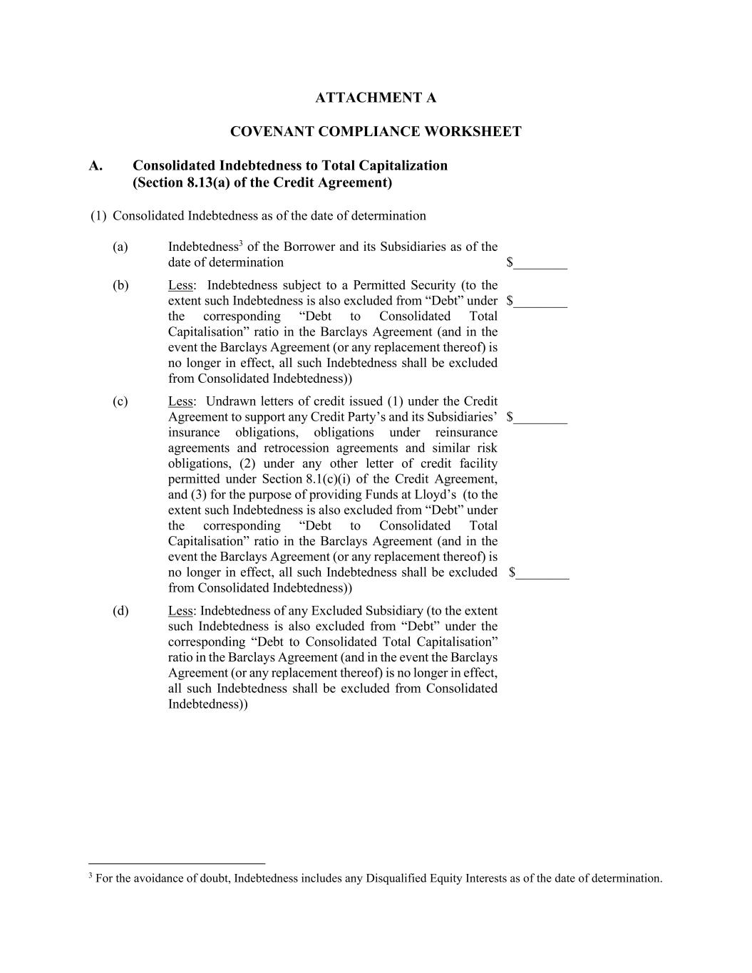 ATTACHMENT A COVENANT COMPLIANCE WORKSHEET A. Consolidated Indebtedness to Total Capitalization (Section 8.13(a) of the Credit Agreement) (1) Consolidated Indebtedness as of the date of determination (a) Indebtedness3 of the Borrower and its Subsidiaries as of the date of determination $________ (b) Less: Indebtedness subject to a Permitted Security (to the extent such Indebtedness is also excluded from “Debt” under the corresponding “Debt to Consolidated Total Capitalisation” ratio in the Barclays Agreement (and in the event the Barclays Agreement (or any replacement thereof) is no longer in effect, all such Indebtedness shall be excluded from Consolidated Indebtedness)) $________ (c) Less: Undrawn letters of credit issued (1) under the Credit Agreement to support any Credit Party’s and its Subsidiaries’ insurance obligations, obligations under reinsurance agreements and retrocession agreements and similar risk obligations, (2) under any other letter of credit facility permitted under Section 8.1(c)(i) of the Credit Agreement, and (3) for the purpose of providing Funds at Lloyd’s (to the extent such Indebtedness is also excluded from “Debt” under the corresponding “Debt to Consolidated Total Capitalisation” ratio in the Barclays Agreement (and in the event the Barclays Agreement (or any replacement thereof) is no longer in effect, all such Indebtedness shall be excluded from Consolidated Indebtedness)) (d) Less: Indebtedness of any Excluded Subsidiary (to the extent such Indebtedness is also excluded from “Debt” under the corresponding “Debt to Consolidated Total Capitalisation” ratio in the Barclays Agreement (and in the event the Barclays Agreement (or any replacement thereof) is no longer in effect, all such Indebtedness shall be excluded from Consolidated Indebtedness)) $________ $_________ 3 For the avoidance of doubt, Indebtedness includes any Disqualified Equity Interests as of the date of determination.