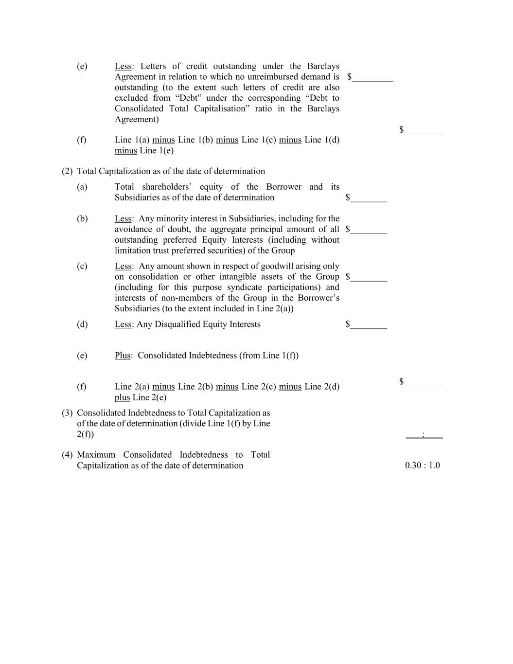 (e) Less: Letters of credit outstanding under the Barclays Agreement in relation to which no unreimbursed demand is outstanding (to the extent such letters of credit are also excluded from “Debt” under the corresponding “Debt to Consolidated Total Capitalisation” ratio in the Barclays Agreement) (f) Line 1(a) minus Line 1(b) minus Line 1(c) minus Line 1(d) minus Line 1(e) $_________ $ (2) Total Capitalization as of the date of determination (a) Total shareholders’ equity of the Borrower and its Subsidiaries as of the date of determination $________ (b) Less: Any minority interest in Subsidiaries, including for the avoidance of doubt, the aggregate principal amount of all outstanding preferred Equity Interests (including without limitation trust preferred securities) of the Group $________ (c) Less: Any amount shown in respect of goodwill arising only on consolidation or other intangible assets of the Group (including for this purpose syndicate participations) and interests of non-members of the Group in the Borrower’s Subsidiaries (to the extent included in Line 2(a)) $________ (d) Less: Any Disqualified Equity Interests (e) Plus: Consolidated Indebtedness (from Line 1(f)) $________ (f) Line 2(a) minus Line 2(b) minus Line 2(c) minus Line 2(d) plus Line 2(e) $ (3) Consolidated Indebtedness to Total Capitalization as of the date of determination (divide Line 1(f) by Line 2(f)) : (4) Maximum Consolidated Indebtedness to Total Capitalization as of the date of determination 0.30 : 1.0