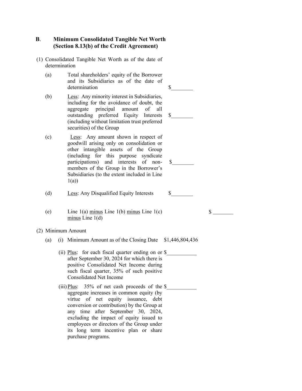 B. Minimum Consolidated Tangible Net Worth (Section 8.13(b) of the Credit Agreement) (1) Consolidated Tangible Net Worth as of the date of determination (a) Total shareholders’ equity of the Borrower and its Subsidiaries as of the date of determination $________ (b) Less: Any minority interest in Subsidiaries, including for the avoidance of doubt, the aggregate principal amount of all outstanding preferred Equity Interests (including without limitation trust preferred securities) of the Group $________ (c) Less: Any amount shown in respect of goodwill arising only on consolidation or other intangible assets of the Group (including for this purpose syndicate participations) and interests of non- members of the Group in the Borrower’s Subsidiaries (to the extent included in Line 1(a)) $________ (d) Less: Any Disqualified Equity Interests (e) Line 1(a) minus Line 1(b) minus Line 1(c) minus Line 1(d) $________ $ (2) Minimum Amount (a) (i) Minimum Amount as of the Closing Date $1,446,804,436 (ii) Plus: for each fiscal quarter ending on or after September 30, 2024 for which there is positive Consolidated Net Income during such fiscal quarter, 35% of such positive Consolidated Net Income $___________ (iii) Plus: 35% of net cash proceeds of the aggregate increases in common equity (by virtue of net equity issuance, debt conversion or contribution) by the Group at any time after September 30, 2024, excluding the impact of equity issued to employees or directors of the Group under its long term incentive plan or share purchase programs. $___________
