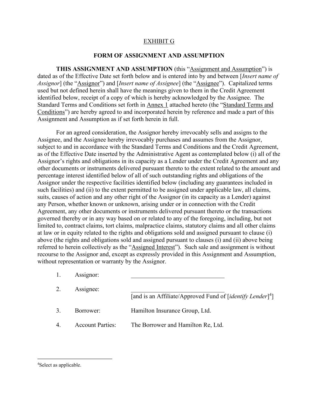 EXHIBIT G FORM OF ASSIGNMENT AND ASSUMPTION THIS ASSIGNMENT AND ASSUMPTION (this “Assignment and Assumption”) is dated as of the Effective Date set forth below and is entered into by and between [Insert name of Assignor] (the “Assignor”) and [Insert name of Assignee] (the “Assignee”). Capitalized terms used but not defined herein shall have the meanings given to them in the Credit Agreement identified below, receipt of a copy of which is hereby acknowledged by the Assignee. The Standard Terms and Conditions set forth in Annex 1 attached hereto (the “Standard Terms and Conditions”) are hereby agreed to and incorporated herein by reference and made a part of this Assignment and Assumption as if set forth herein in full. For an agreed consideration, the Assignor hereby irrevocably sells and assigns to the Assignee, and the Assignee hereby irrevocably purchases and assumes from the Assignor, subject to and in accordance with the Standard Terms and Conditions and the Credit Agreement, as of the Effective Date inserted by the Administrative Agent as contemplated below (i) all of the Assignor’s rights and obligations in its capacity as a Lender under the Credit Agreement and any other documents or instruments delivered pursuant thereto to the extent related to the amount and percentage interest identified below of all of such outstanding rights and obligations of the Assignor under the respective facilities identified below (including any guarantees included in such facilities) and (ii) to the extent permitted to be assigned under applicable law, all claims, suits, causes of action and any other right of the Assignor (in its capacity as a Lender) against any Person, whether known or unknown, arising under or in connection with the Credit Agreement, any other documents or instruments delivered pursuant thereto or the transactions governed thereby or in any way based on or related to any of the foregoing, including, but not limited to, contract claims, tort claims, malpractice claims, statutory claims and all other claims at law or in equity related to the rights and obligations sold and assigned pursuant to clause (i) above (the rights and obligations sold and assigned pursuant to clauses (i) and (ii) above being referred to herein collectively as the “Assigned Interest”). Such sale and assignment is without recourse to the Assignor and, except as expressly provided in this Assignment and Assumption, without representation or warranty by the Assignor. 1. Assignor: ______________________________ 2. Assignee: ______________________________ [and is an Affiliate/Approved Fund of [identify Lender]4] 3. Borrower: Hamilton Insurance Group, Ltd. 4. Account Parties: The Borrower and Hamilton Re, Ltd. 4Select as applicable.