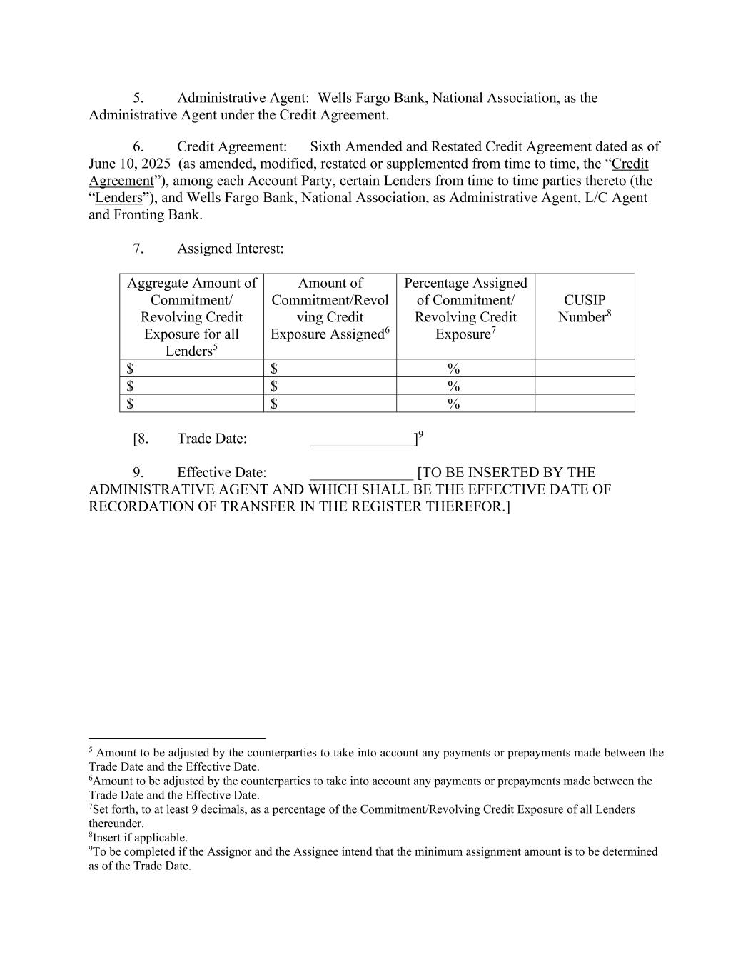 5. Administrative Agent: Wells Fargo Bank, National Association, as the Administrative Agent under the Credit Agreement. 6. Credit Agreement: Sixth Amended and Restated Credit Agreement dated as of June 10, 2025 (as amended, modified, restated or supplemented from time to time, the “Credit Agreement”), among each Account Party, certain Lenders from time to time parties thereto (the “Lenders”), and Wells Fargo Bank, National Association, as Administrative Agent, L/C Agent and Fronting Bank. 7. Assigned Interest: Aggregate Amount of Commitment/ Revolving Credit Exposure for all Lenders5 Amount of Commitment/Revol ving Credit Exposure Assigned6 Percentage Assigned of Commitment/ Revolving Credit Exposure7 CUSIP Number8 $ $ % $ $ % $ $ % [8. Trade Date: ______________]9 9. Effective Date: ______________ [TO BE INSERTED BY THE ADMINISTRATIVE AGENT AND WHICH SHALL BE THE EFFECTIVE DATE OF RECORDATION OF TRANSFER IN THE REGISTER THEREFOR.] 5 Amount to be adjusted by the counterparties to take into account any payments or prepayments made between the Trade Date and the Effective Date. 6Amount to be adjusted by the counterparties to take into account any payments or prepayments made between the Trade Date and the Effective Date. 7Set forth, to at least 9 decimals, as a percentage of the Commitment/Revolving Credit Exposure of all Lenders thereunder. 8Insert if applicable. 9To be completed if the Assignor and the Assignee intend that the minimum assignment amount is to be determined as of the Trade Date.
