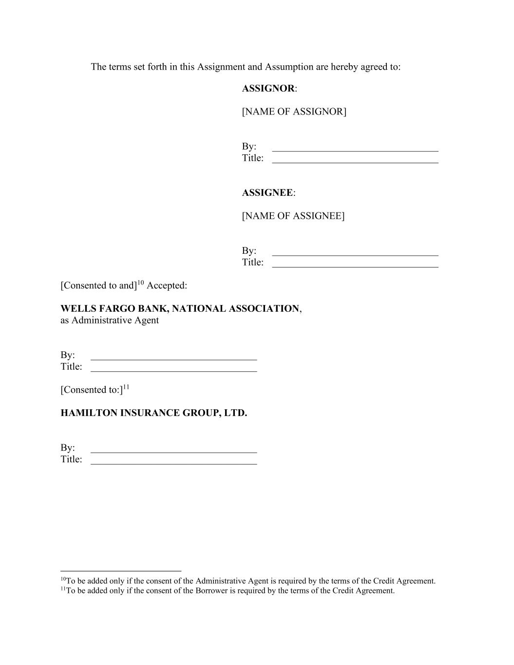 The terms set forth in this Assignment and Assumption are hereby agreed to: ASSIGNOR: [NAME OF ASSIGNOR] By: _________________________________ Title: _________________________________ ASSIGNEE: [NAME OF ASSIGNEE] By: _________________________________ Title: _________________________________ [Consented to and]10 Accepted: WELLS FARGO BANK, NATIONAL ASSOCIATION, as Administrative Agent By: _________________________________ Title: _________________________________ [Consented to:]11 HAMILTON INSURANCE GROUP, LTD. By: _________________________________ Title: _________________________________ 10To be added only if the consent of the Administrative Agent is required by the terms of the Credit Agreement. 11To be added only if the consent of the Borrower is required by the terms of the Credit Agreement.