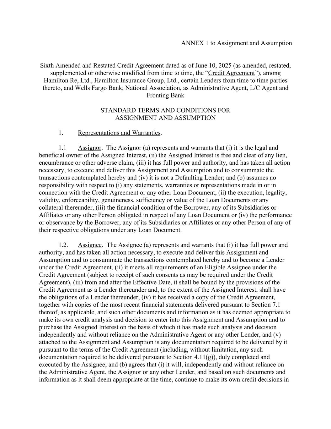 ANNEX 1 to Assignment and Assumption Sixth Amended and Restated Credit Agreement dated as of June 10, 2025 (as amended, restated, supplemented or otherwise modified from time to time, the “Credit Agreement”), among Hamilton Re, Ltd., Hamilton Insurance Group, Ltd., certain Lenders from time to time parties thereto, and Wells Fargo Bank, National Association, as Administrative Agent, L/C Agent and Fronting Bank STANDARD TERMS AND CONDITIONS FOR ASSIGNMENT AND ASSUMPTION 1. Representations and Warranties. 1.1 Assignor. The Assignor (a) represents and warrants that (i) it is the legal and beneficial owner of the Assigned Interest, (ii) the Assigned Interest is free and clear of any lien, encumbrance or other adverse claim, (iii) it has full power and authority, and has taken all action necessary, to execute and deliver this Assignment and Assumption and to consummate the transactions contemplated hereby and (iv) it is not a Defaulting Lender; and (b) assumes no responsibility with respect to (i) any statements, warranties or representations made in or in connection with the Credit Agreement or any other Loan Document, (ii) the execution, legality, validity, enforceability, genuineness, sufficiency or value of the Loan Documents or any collateral thereunder, (iii) the financial condition of the Borrower, any of its Subsidiaries or Affiliates or any other Person obligated in respect of any Loan Document or (iv) the performance or observance by the Borrower, any of its Subsidiaries or Affiliates or any other Person of any of their respective obligations under any Loan Document. 1.2. Assignee. The Assignee (a) represents and warrants that (i) it has full power and authority, and has taken all action necessary, to execute and deliver this Assignment and Assumption and to consummate the transactions contemplated hereby and to become a Lender under the Credit Agreement, (ii) it meets all requirements of an Eligible Assignee under the Credit Agreement (subject to receipt of such consents as may be required under the Credit Agreement), (iii) from and after the Effective Date, it shall be bound by the provisions of the Credit Agreement as a Lender thereunder and, to the extent of the Assigned Interest, shall have the obligations of a Lender thereunder, (iv) it has received a copy of the Credit Agreement, together with copies of the most recent financial statements delivered pursuant to Section 7.1 thereof, as applicable, and such other documents and information as it has deemed appropriate to make its own credit analysis and decision to enter into this Assignment and Assumption and to purchase the Assigned Interest on the basis of which it has made such analysis and decision independently and without reliance on the Administrative Agent or any other Lender, and (v) attached to the Assignment and Assumption is any documentation required to be delivered by it pursuant to the terms of the Credit Agreement (including, without limitation, any such documentation required to be delivered pursuant to Section 4.11(g)), duly completed and executed by the Assignee; and (b) agrees that (i) it will, independently and without reliance on the Administrative Agent, the Assignor or any other Lender, and based on such documents and information as it shall deem appropriate at the time, continue to make its own credit decisions in