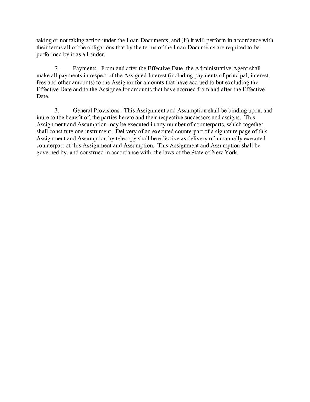 taking or not taking action under the Loan Documents, and (ii) it will perform in accordance with their terms all of the obligations that by the terms of the Loan Documents are required to be performed by it as a Lender. 2. Payments. From and after the Effective Date, the Administrative Agent shall make all payments in respect of the Assigned Interest (including payments of principal, interest, fees and other amounts) to the Assignor for amounts that have accrued to but excluding the Effective Date and to the Assignee for amounts that have accrued from and after the Effective Date. 3. General Provisions. This Assignment and Assumption shall be binding upon, and inure to the benefit of, the parties hereto and their respective successors and assigns. This Assignment and Assumption may be executed in any number of counterparts, which together shall constitute one instrument. Delivery of an executed counterpart of a signature page of this Assignment and Assumption by telecopy shall be effective as delivery of a manually executed counterpart of this Assignment and Assumption. This Assignment and Assumption shall be governed by, and construed in accordance with, the laws of the State of New York.