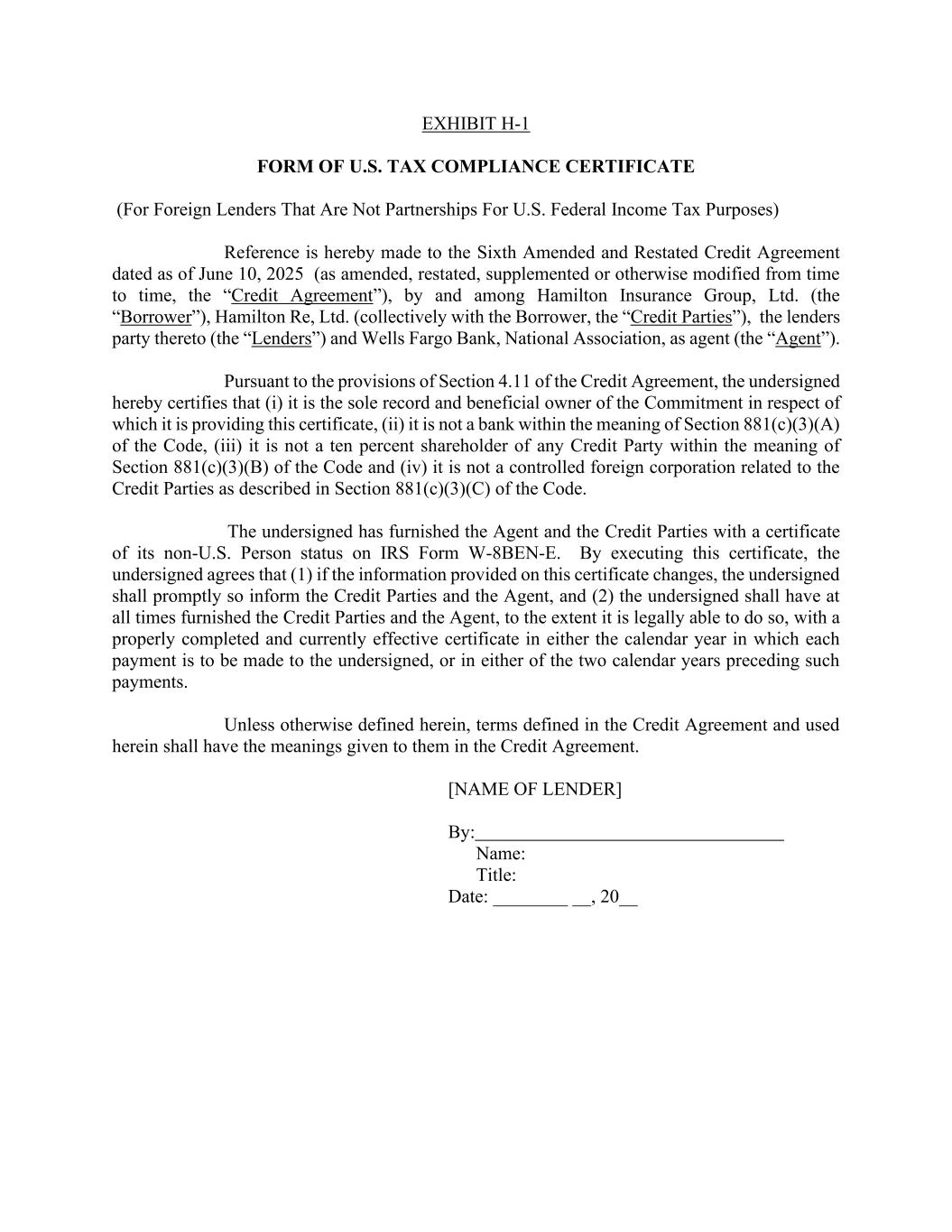 EXHIBIT H-1 FORM OF U.S. TAX COMPLIANCE CERTIFICATE (For Foreign Lenders That Are Not Partnerships For U.S. Federal Income Tax Purposes) Reference is hereby made to the Sixth Amended and Restated Credit Agreement dated as of June 10, 2025 (as amended, restated, supplemented or otherwise modified from time to time, the “Credit Agreement”), by and among Hamilton Insurance Group, Ltd. (the “Borrower”), Hamilton Re, Ltd. (collectively with the Borrower, the “Credit Parties”), the lenders party thereto (the “Lenders”) and Wells Fargo Bank, National Association, as agent (the “Agent”). Pursuant to the provisions of Section 4.11 of the Credit Agreement, the undersigned hereby certifies that (i) it is the sole record and beneficial owner of the Commitment in respect of which it is providing this certificate, (ii) it is not a bank within the meaning of Section 881(c)(3)(A) of the Code, (iii) it is not a ten percent shareholder of any Credit Party within the meaning of Section 881(c)(3)(B) of the Code and (iv) it is not a controlled foreign corporation related to the Credit Parties as described in Section 881(c)(3)(C) of the Code. The undersigned has furnished the Agent and the Credit Parties with a certificate of its non-U.S. Person status on IRS Form W-8BEN-E. By executing this certificate, the undersigned agrees that (1) if the information provided on this certificate changes, the undersigned shall promptly so inform the Credit Parties and the Agent, and (2) the undersigned shall have at all times furnished the Credit Parties and the Agent, to the extent it is legally able to do so, with a properly completed and currently effective certificate in either the calendar year in which each payment is to be made to the undersigned, or in either of the two calendar years preceding such payments. Unless otherwise defined herein, terms defined in the Credit Agreement and used herein shall have the meanings given to them in the Credit Agreement. [NAME OF LENDER] By: Name: Title: Date: ________ __, 20__