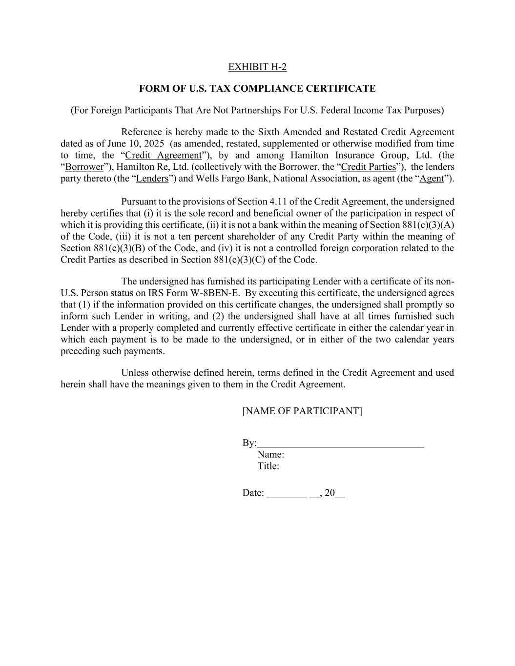 EXHIBIT H-2 FORM OF U.S. TAX COMPLIANCE CERTIFICATE (For Foreign Participants That Are Not Partnerships For U.S. Federal Income Tax Purposes) Reference is hereby made to the Sixth Amended and Restated Credit Agreement dated as of June 10, 2025 (as amended, restated, supplemented or otherwise modified from time to time, the “Credit Agreement”), by and among Hamilton Insurance Group, Ltd. (the “Borrower”), Hamilton Re, Ltd. (collectively with the Borrower, the “Credit Parties”), the lenders party thereto (the “Lenders”) and Wells Fargo Bank, National Association, as agent (the “Agent”). Pursuant to the provisions of Section 4.11 of the Credit Agreement, the undersigned hereby certifies that (i) it is the sole record and beneficial owner of the participation in respect of which it is providing this certificate, (ii) it is not a bank within the meaning of Section 881(c)(3)(A) of the Code, (iii) it is not a ten percent shareholder of any Credit Party within the meaning of Section 881(c)(3)(B) of the Code, and (iv) it is not a controlled foreign corporation related to the Credit Parties as described in Section 881(c)(3)(C) of the Code. The undersigned has furnished its participating Lender with a certificate of its non- U.S. Person status on IRS Form W-8BEN-E. By executing this certificate, the undersigned agrees that (1) if the information provided on this certificate changes, the undersigned shall promptly so inform such Lender in writing, and (2) the undersigned shall have at all times furnished such Lender with a properly completed and currently effective certificate in either the calendar year in which each payment is to be made to the undersigned, or in either of the two calendar years preceding such payments. Unless otherwise defined herein, terms defined in the Credit Agreement and used herein shall have the meanings given to them in the Credit Agreement. [NAME OF PARTICIPANT] By: Name: Title: Date: ________ __, 20__