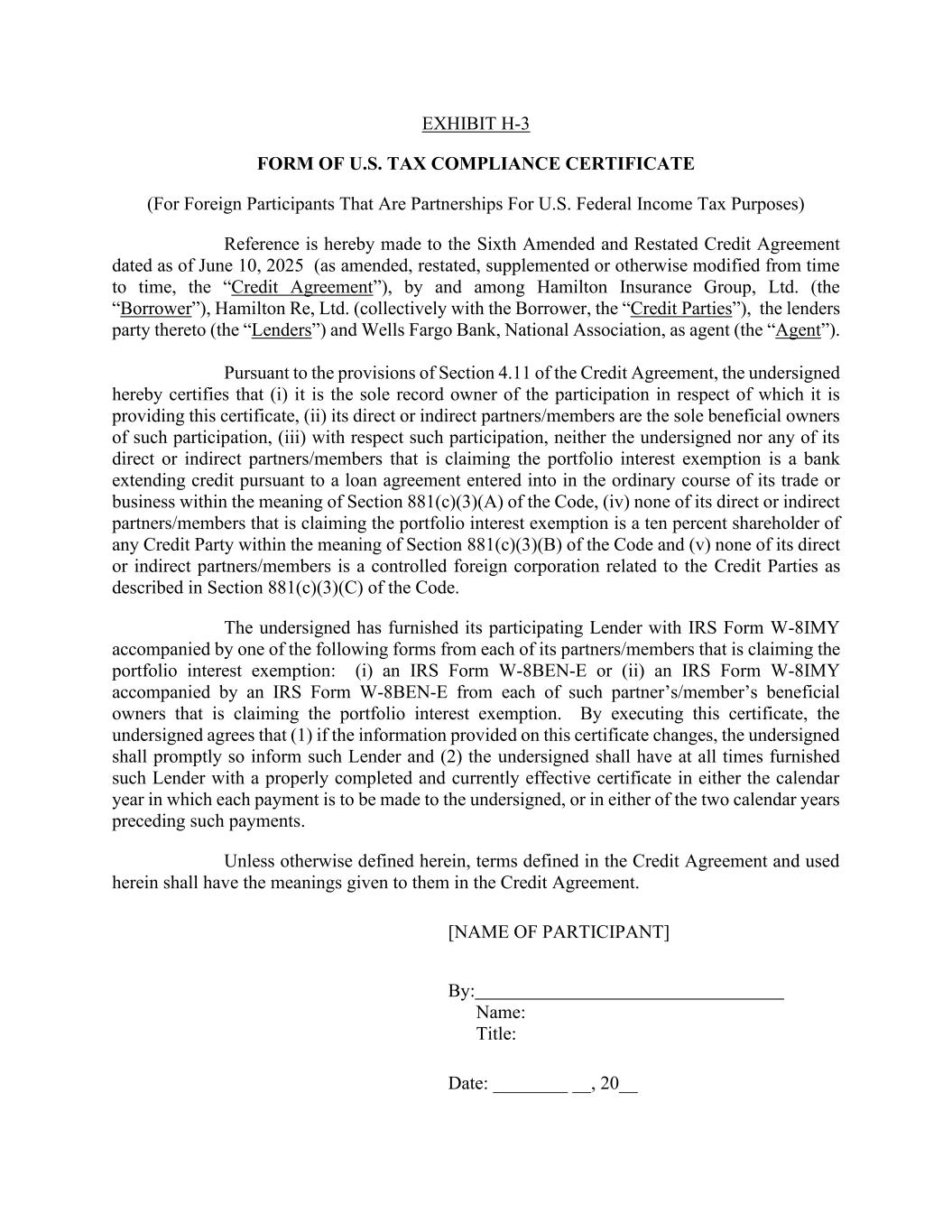 EXHIBIT H-3 FORM OF U.S. TAX COMPLIANCE CERTIFICATE (For Foreign Participants That Are Partnerships For U.S. Federal Income Tax Purposes) Reference is hereby made to the Sixth Amended and Restated Credit Agreement dated as of June 10, 2025 (as amended, restated, supplemented or otherwise modified from time to time, the “Credit Agreement”), by and among Hamilton Insurance Group, Ltd. (the “Borrower”), Hamilton Re, Ltd. (collectively with the Borrower, the “Credit Parties”), the lenders party thereto (the “Lenders”) and Wells Fargo Bank, National Association, as agent (the “Agent”). Pursuant to the provisions of Section 4.11 of the Credit Agreement, the undersigned hereby certifies that (i) it is the sole record owner of the participation in respect of which it is providing this certificate, (ii) its direct or indirect partners/members are the sole beneficial owners of such participation, (iii) with respect such participation, neither the undersigned nor any of its direct or indirect partners/members that is claiming the portfolio interest exemption is a bank extending credit pursuant to a loan agreement entered into in the ordinary course of its trade or business within the meaning of Section 881(c)(3)(A) of the Code, (iv) none of its direct or indirect partners/members that is claiming the portfolio interest exemption is a ten percent shareholder of any Credit Party within the meaning of Section 881(c)(3)(B) of the Code and (v) none of its direct or indirect partners/members is a controlled foreign corporation related to the Credit Parties as described in Section 881(c)(3)(C) of the Code. The undersigned has furnished its participating Lender with IRS Form W-8IMY accompanied by one of the following forms from each of its partners/members that is claiming the portfolio interest exemption: (i) an IRS Form W-8BEN-E or (ii) an IRS Form W-8IMY accompanied by an IRS Form W-8BEN-E from each of such partner’s/member’s beneficial owners that is claiming the portfolio interest exemption. By executing this certificate, the undersigned agrees that (1) if the information provided on this certificate changes, the undersigned shall promptly so inform such Lender and (2) the undersigned shall have at all times furnished such Lender with a properly completed and currently effective certificate in either the calendar year in which each payment is to be made to the undersigned, or in either of the two calendar years preceding such payments. Unless otherwise defined herein, terms defined in the Credit Agreement and used herein shall have the meanings given to them in the Credit Agreement. [NAME OF PARTICIPANT] By: Name: Title: Date: ________ __, 20__
