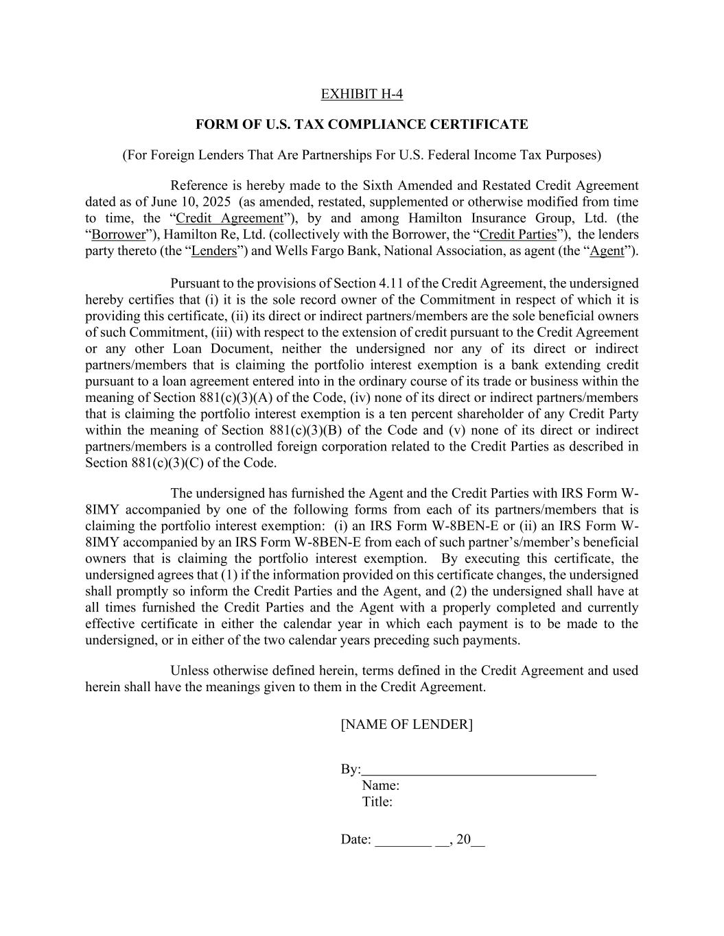 EXHIBIT H-4 FORM OF U.S. TAX COMPLIANCE CERTIFICATE (For Foreign Lenders That Are Partnerships For U.S. Federal Income Tax Purposes) Reference is hereby made to the Sixth Amended and Restated Credit Agreement dated as of June 10, 2025 (as amended, restated, supplemented or otherwise modified from time to time, the “Credit Agreement”), by and among Hamilton Insurance Group, Ltd. (the “Borrower”), Hamilton Re, Ltd. (collectively with the Borrower, the “Credit Parties”), the lenders party thereto (the “Lenders”) and Wells Fargo Bank, National Association, as agent (the “Agent”). Pursuant to the provisions of Section 4.11 of the Credit Agreement, the undersigned hereby certifies that (i) it is the sole record owner of the Commitment in respect of which it is providing this certificate, (ii) its direct or indirect partners/members are the sole beneficial owners of such Commitment, (iii) with respect to the extension of credit pursuant to the Credit Agreement or any other Loan Document, neither the undersigned nor any of its direct or indirect partners/members that is claiming the portfolio interest exemption is a bank extending credit pursuant to a loan agreement entered into in the ordinary course of its trade or business within the meaning of Section 881(c)(3)(A) of the Code, (iv) none of its direct or indirect partners/members that is claiming the portfolio interest exemption is a ten percent shareholder of any Credit Party within the meaning of Section 881(c)(3)(B) of the Code and (v) none of its direct or indirect partners/members is a controlled foreign corporation related to the Credit Parties as described in Section 881(c)(3)(C) of the Code. The undersigned has furnished the Agent and the Credit Parties with IRS Form W- 8IMY accompanied by one of the following forms from each of its partners/members that is claiming the portfolio interest exemption: (i) an IRS Form W-8BEN-E or (ii) an IRS Form W- 8IMY accompanied by an IRS Form W-8BEN-E from each of such partner’s/member’s beneficial owners that is claiming the portfolio interest exemption. By executing this certificate, the undersigned agrees that (1) if the information provided on this certificate changes, the undersigned shall promptly so inform the Credit Parties and the Agent, and (2) the undersigned shall have at all times furnished the Credit Parties and the Agent with a properly completed and currently effective certificate in either the calendar year in which each payment is to be made to the undersigned, or in either of the two calendar years preceding such payments. Unless otherwise defined herein, terms defined in the Credit Agreement and used herein shall have the meanings given to them in the Credit Agreement. [NAME OF LENDER] By: Name: Title: Date: ________ __, 20__