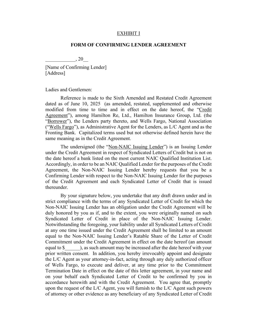 EXHIBIT I FORM OF CONFIRMING LENDER AGREEMENT ____________, 20__ [Name of Confirming Lender] [Address] Ladies and Gentlemen: Reference is made to the Sixth Amended and Restated Credit Agreement dated as of June 10, 2025 (as amended, restated, supplemented and otherwise modified from time to time and in effect on the date hereof, the “Credit Agreement”), among Hamilton Re, Ltd., Hamilton Insurance Group, Ltd. (the “Borrower”), the Lenders party thereto, and Wells Fargo, National Association (“Wells Fargo”), as Administrative Agent for the Lenders, as L/C Agent and as the Fronting Bank. Capitalized terms used but not otherwise defined herein have the same meaning as in the Credit Agreement. The undersigned (the “Non-NAIC Issuing Lender”) is an Issuing Lender under the Credit Agreement in respect of Syndicated Letters of Credit but is not on the date hereof a bank listed on the most current NAIC Qualified Institution List. Accordingly, in order to be an NAIC Qualified Lender for the purposes of the Credit Agreement, the Non-NAIC Issuing Lender hereby requests that you be a Confirming Lender with respect to the Non-NAIC Issuing Lender for the purposes of the Credit Agreement and each Syndicated Letter of Credit that is issued thereunder. By your signature below, you undertake that any draft drawn under and in strict compliance with the terms of any Syndicated Letter of Credit for which the Non-NAIC Issuing Lender has an obligation under the Credit Agreement will be duly honored by you as if, and to the extent, you were originally named on such Syndicated Letter of Credit in place of the Non-NAIC Issuing Lender. Notwithstanding the foregoing, your liability under all Syndicated Letters of Credit at any one time issued under the Credit Agreement shall be limited to an amount equal to the Non-NAIC Issuing Lender’s Ratable Share of the Letter of Credit Commitment under the Credit Agreement in effect on the date hereof (an amount equal to $______), as such amount may be increased after the date hereof with your prior written consent. In addition, you hereby irrevocably appoint and designate the L/C Agent as your attorney-in-fact, acting through any duly authorized officer of Wells Fargo, to execute and deliver, at any time prior to the Commitment Termination Date in effect on the date of this letter agreement, in your name and on your behalf each Syndicated Letter of Credit to be confirmed by you in accordance herewith and with the Credit Agreement. You agree that, promptly upon the request of the L/C Agent, you will furnish to the L/C Agent such powers of attorney or other evidence as any beneficiary of any Syndicated Letter of Credit