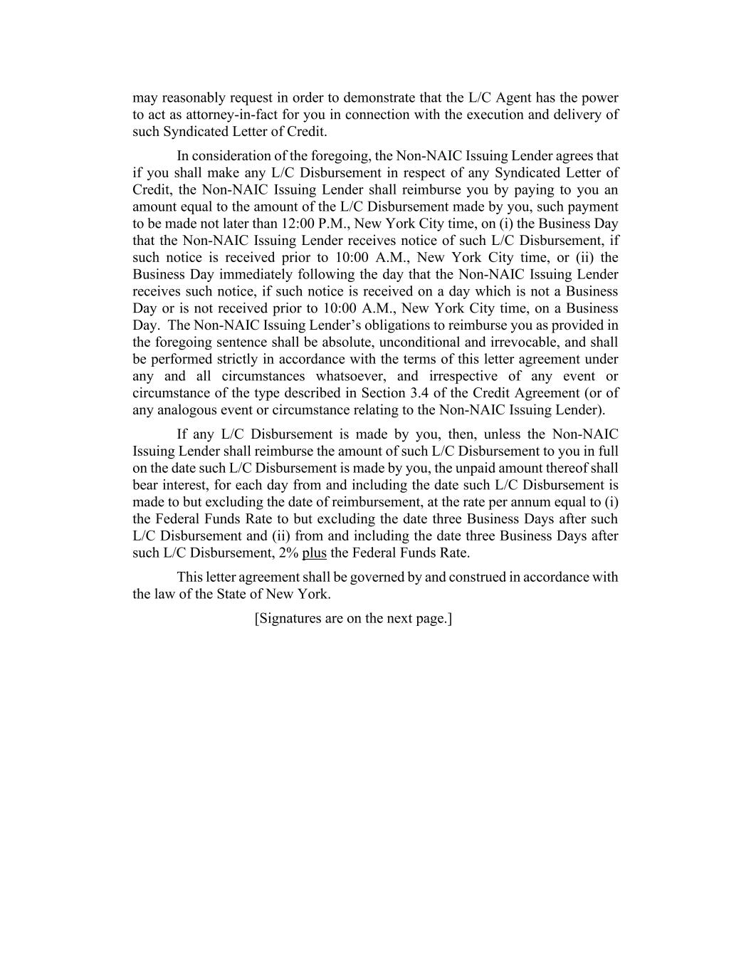 may reasonably request in order to demonstrate that the L/C Agent has the power to act as attorney-in-fact for you in connection with the execution and delivery of such Syndicated Letter of Credit. In consideration of the foregoing, the Non-NAIC Issuing Lender agrees that if you shall make any L/C Disbursement in respect of any Syndicated Letter of Credit, the Non-NAIC Issuing Lender shall reimburse you by paying to you an amount equal to the amount of the L/C Disbursement made by you, such payment to be made not later than 12:00 P.M., New York City time, on (i) the Business Day that the Non-NAIC Issuing Lender receives notice of such L/C Disbursement, if such notice is received prior to 10:00 A.M., New York City time, or (ii) the Business Day immediately following the day that the Non-NAIC Issuing Lender receives such notice, if such notice is received on a day which is not a Business Day or is not received prior to 10:00 A.M., New York City time, on a Business Day. The Non-NAIC Issuing Lender’s obligations to reimburse you as provided in the foregoing sentence shall be absolute, unconditional and irrevocable, and shall be performed strictly in accordance with the terms of this letter agreement under any and all circumstances whatsoever, and irrespective of any event or circumstance of the type described in Section 3.4 of the Credit Agreement (or of any analogous event or circumstance relating to the Non-NAIC Issuing Lender). If any L/C Disbursement is made by you, then, unless the Non-NAIC Issuing Lender shall reimburse the amount of such L/C Disbursement to you in full on the date such L/C Disbursement is made by you, the unpaid amount thereof shall bear interest, for each day from and including the date such L/C Disbursement is made to but excluding the date of reimbursement, at the rate per annum equal to (i) the Federal Funds Rate to but excluding the date three Business Days after such L/C Disbursement and (ii) from and including the date three Business Days after such L/C Disbursement, 2% plus the Federal Funds Rate. This letter agreement shall be governed by and construed in accordance with the law of the State of New York. [Signatures are on the next page.]