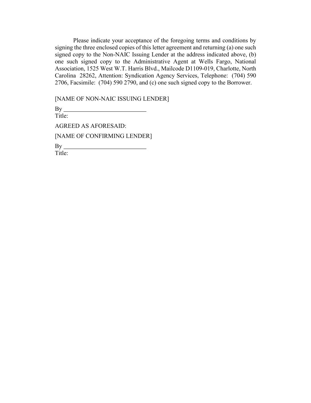 Please indicate your acceptance of the foregoing terms and conditions by signing the three enclosed copies of this letter agreement and returning (a) one such signed copy to the Non-NAIC Issuing Lender at the address indicated above, (b) one such signed copy to the Administrative Agent at Wells Fargo, National Association, 1525 West W.T. Harris Blvd., Mailcode D1109-019, Charlotte, North Carolina 28262, Attention: Syndication Agency Services, Telephone: (704) 590 2706, Facsimile: (704) 590 2790, and (c) one such signed copy to the Borrower. [NAME OF NON-NAIC ISSUING LENDER] By Title: AGREED AS AFORESAID: [NAME OF CONFIRMING LENDER] By Title: