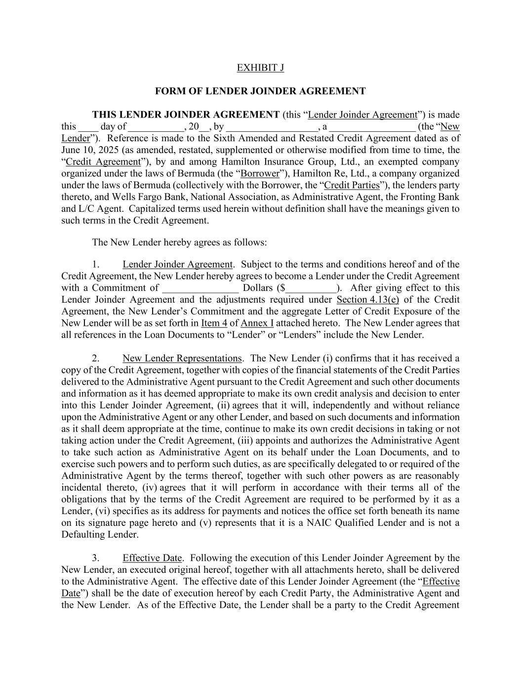 EXHIBIT J FORM OF LENDER JOINDER AGREEMENT THIS LENDER JOINDER AGREEMENT (this “Lender Joinder Agreement”) is made this ____ day of ___________, 20__, by __________________, a _________________ (the “New Lender”). Reference is made to the Sixth Amended and Restated Credit Agreement dated as of June 10, 2025 (as amended, restated, supplemented or otherwise modified from time to time, the “Credit Agreement”), by and among Hamilton Insurance Group, Ltd., an exempted company organized under the laws of Bermuda (the “Borrower”), Hamilton Re, Ltd., a company organized under the laws of Bermuda (collectively with the Borrower, the “Credit Parties”), the lenders party thereto, and Wells Fargo Bank, National Association, as Administrative Agent, the Fronting Bank and L/C Agent. Capitalized terms used herein without definition shall have the meanings given to such terms in the Credit Agreement. The New Lender hereby agrees as follows: 1. Lender Joinder Agreement. Subject to the terms and conditions hereof and of the Credit Agreement, the New Lender hereby agrees to become a Lender under the Credit Agreement with a Commitment of _______________ Dollars ($__________). After giving effect to this Lender Joinder Agreement and the adjustments required under Section 4.13(e) of the Credit Agreement, the New Lender’s Commitment and the aggregate Letter of Credit Exposure of the New Lender will be as set forth in Item 4 of Annex I attached hereto. The New Lender agrees that all references in the Loan Documents to “Lender” or “Lenders” include the New Lender. 2. New Lender Representations. The New Lender (i) confirms that it has received a copy of the Credit Agreement, together with copies of the financial statements of the Credit Parties delivered to the Administrative Agent pursuant to the Credit Agreement and such other documents and information as it has deemed appropriate to make its own credit analysis and decision to enter into this Lender Joinder Agreement, (ii) agrees that it will, independently and without reliance upon the Administrative Agent or any other Lender, and based on such documents and information as it shall deem appropriate at the time, continue to make its own credit decisions in taking or not taking action under the Credit Agreement, (iii) appoints and authorizes the Administrative Agent to take such action as Administrative Agent on its behalf under the Loan Documents, and to exercise such powers and to perform such duties, as are specifically delegated to or required of the Administrative Agent by the terms thereof, together with such other powers as are reasonably incidental thereto, (iv) agrees that it will perform in accordance with their terms all of the obligations that by the terms of the Credit Agreement are required to be performed by it as a Lender, (vi) specifies as its address for payments and notices the office set forth beneath its name on its signature page hereto and (v) represents that it is a NAIC Qualified Lender and is not a Defaulting Lender. 3. Effective Date. Following the execution of this Lender Joinder Agreement by the New Lender, an executed original hereof, together with all attachments hereto, shall be delivered to the Administrative Agent. The effective date of this Lender Joinder Agreement (the “Effective Date”) shall be the date of execution hereof by each Credit Party, the Administrative Agent and the New Lender. As of the Effective Date, the Lender shall be a party to the Credit Agreement