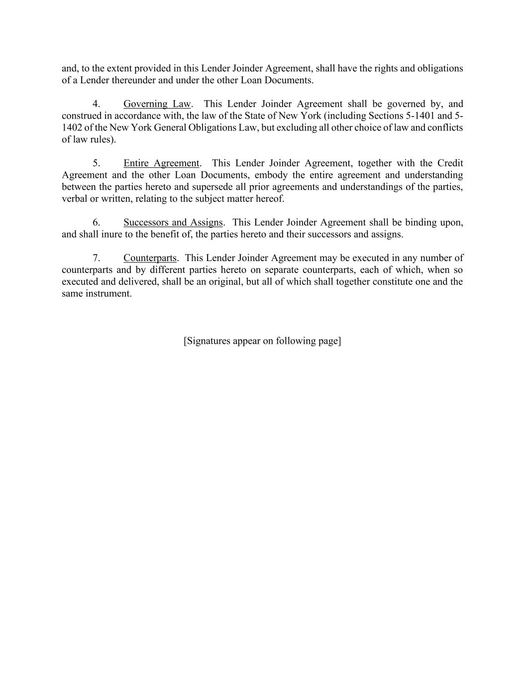 and, to the extent provided in this Lender Joinder Agreement, shall have the rights and obligations of a Lender thereunder and under the other Loan Documents. 4. Governing Law. This Lender Joinder Agreement shall be governed by, and construed in accordance with, the law of the State of New York (including Sections 5-1401 and 5- 1402 of the New York General Obligations Law, but excluding all other choice of law and conflicts of law rules). 5. Entire Agreement. This Lender Joinder Agreement, together with the Credit Agreement and the other Loan Documents, embody the entire agreement and understanding between the parties hereto and supersede all prior agreements and understandings of the parties, verbal or written, relating to the subject matter hereof. 6. Successors and Assigns. This Lender Joinder Agreement shall be binding upon, and shall inure to the benefit of, the parties hereto and their successors and assigns. 7. Counterparts. This Lender Joinder Agreement may be executed in any number of counterparts and by different parties hereto on separate counterparts, each of which, when so executed and delivered, shall be an original, but all of which shall together constitute one and the same instrument. [Signatures appear on following page]