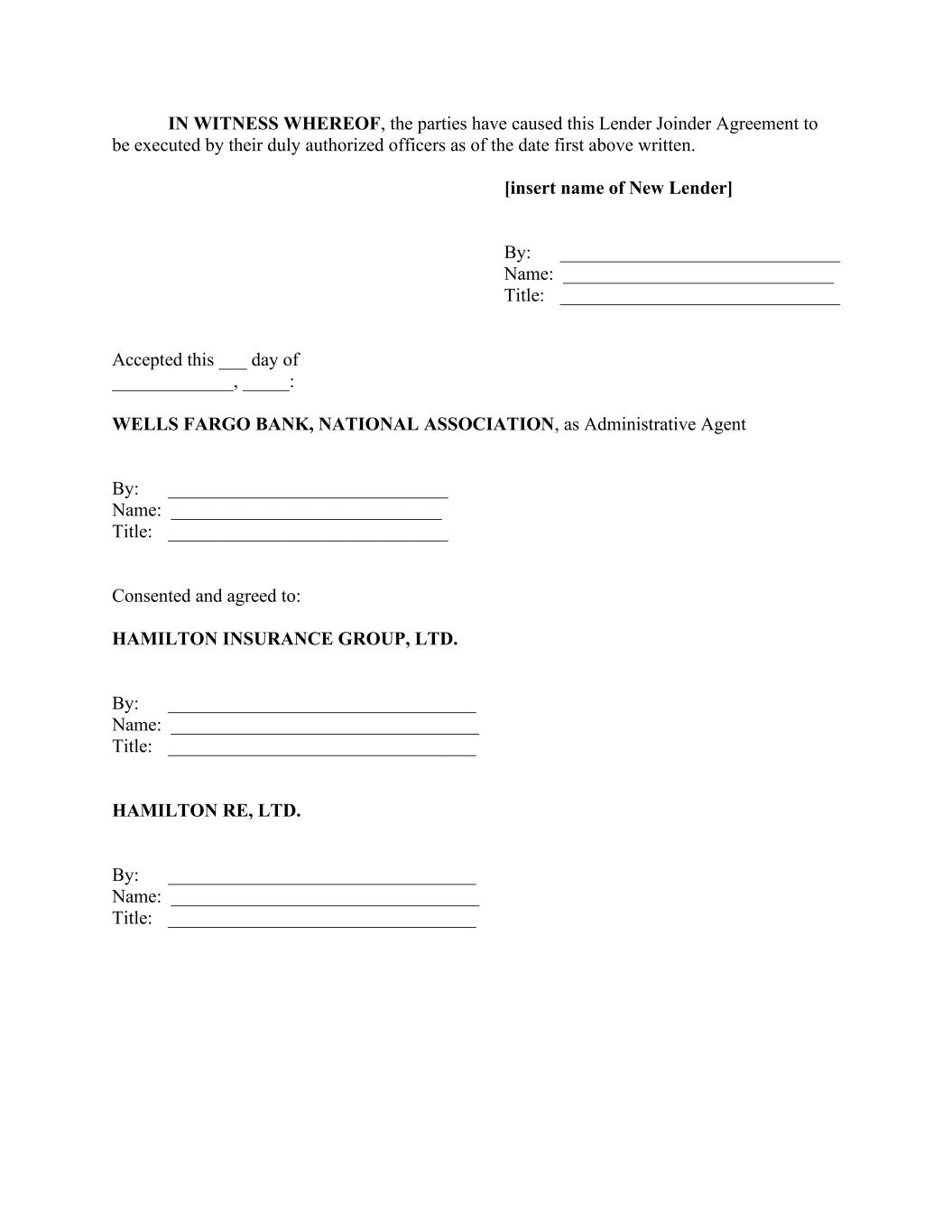 IN WITNESS WHEREOF, the parties have caused this Lender Joinder Agreement to be executed by their duly authorized officers as of the date first above written. [insert name of New Lender] By: ______________________________ Name: _____________________________ Title: ______________________________ Accepted this ___ day of _____________, _____: WELLS FARGO BANK, NATIONAL ASSOCIATION, as Administrative Agent By: ______________________________ Name: _____________________________ Title: ______________________________ Consented and agreed to: HAMILTON INSURANCE GROUP, LTD. By: _________________________________ Name: _________________________________ Title: _________________________________ HAMILTON RE, LTD. By: _________________________________ Name: _________________________________ Title: _________________________________