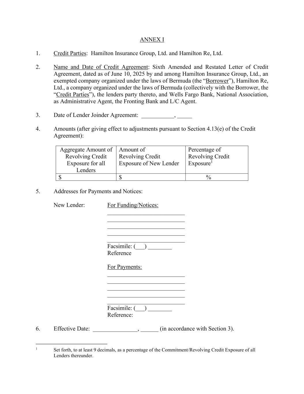 ANNEX I 1. Credit Parties: Hamilton Insurance Group, Ltd. and Hamilton Re, Ltd. 2. Name and Date of Credit Agreement: Sixth Amended and Restated Letter of Credit Agreement, dated as of June 10, 2025 by and among Hamilton Insurance Group, Ltd., an exempted company organized under the laws of Bermuda (the “Borrower”), Hamilton Re, Ltd., a company organized under the laws of Bermuda (collectively with the Borrower, the “Credit Parties”), the lenders party thereto, and Wells Fargo Bank, National Association, as Administrative Agent, the Fronting Bank and L/C Agent. 3. Date of Lender Joinder Agreement: ___________, _____ 4. Amounts (after giving effect to adjustments pursuant to Section 4.13(e) of the Credit Agreement): Aggregate Amount of Revolving Credit Exposure for all Lenders Amount of Revolving Credit Exposure of New Lender Percentage of Revolving Credit Exposure1 $ $ % 5. Addresses for Payments and Notices: New Lender: For Funding/Notices: __________________________ __________________________ __________________________ __________________________ __________________________ Facsimile: (___) ________ Reference For Payments: __________________________ __________________________ __________________________ __________________________ __________________________ Facsimile: (___) ________ Reference: 6. Effective Date: _______________, ______ (in accordance with Section 3). 1 Set forth, to at least 9 decimals, as a percentage of the Commitment/Revolving Credit Exposure of all Lenders thereunder.