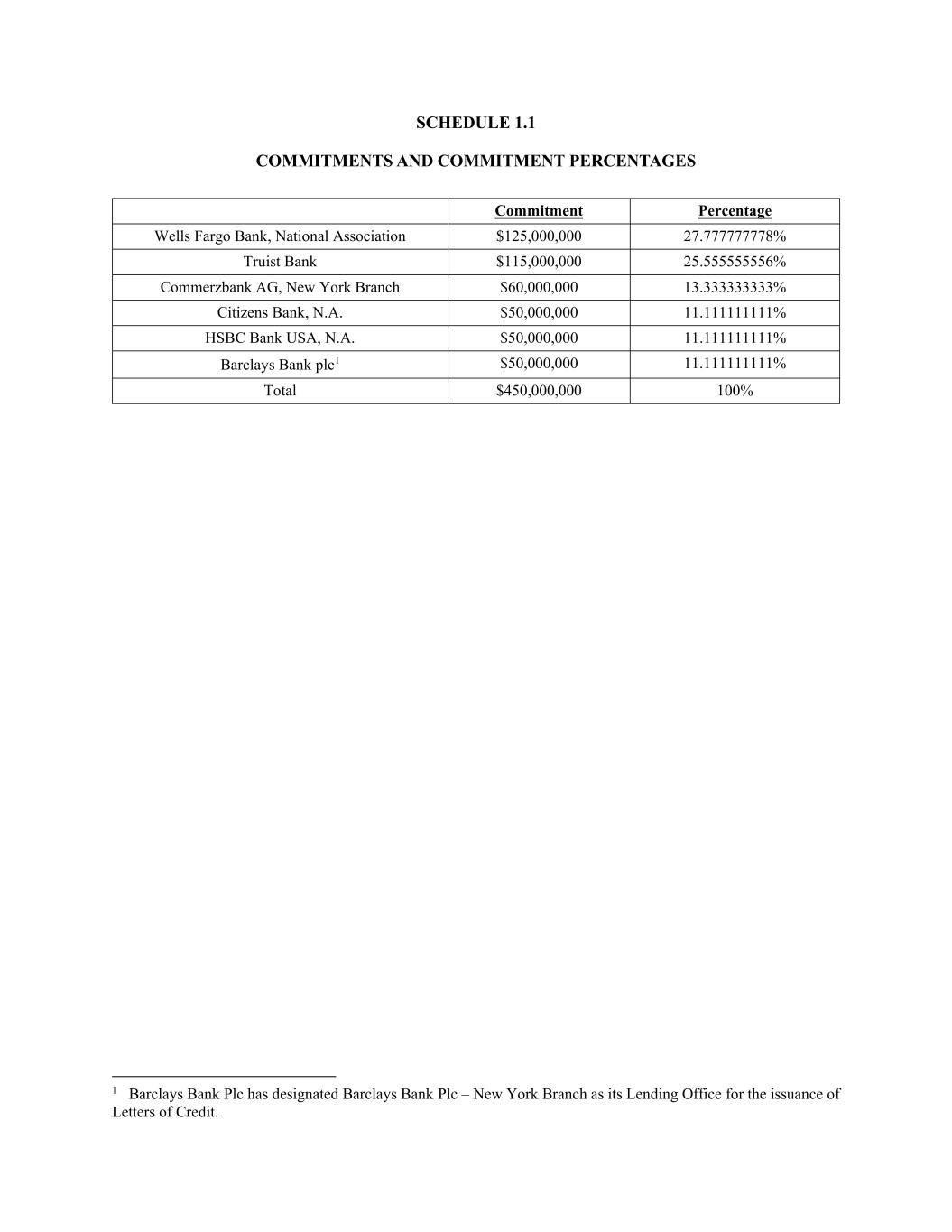 SCHEDULE 1.1 COMMITMENTS AND COMMITMENT PERCENTAGES Commitment Percentage Wells Fargo Bank, National Association $125,000,000 27.777777778% Truist Bank $115,000,000 25.555555556% Commerzbank AG, New York Branch $60,000,000 13.333333333% Citizens Bank, N.A. $50,000,000 11.111111111% HSBC Bank USA, N.A. $50,000,000 11.111111111% Barclays Bank plc1 $50,000,000 11.111111111% Total $450,000,000 100% 1 Barclays Bank Plc has designated Barclays Bank Plc – New York Branch as its Lending Office for the issuance of Letters of Credit.