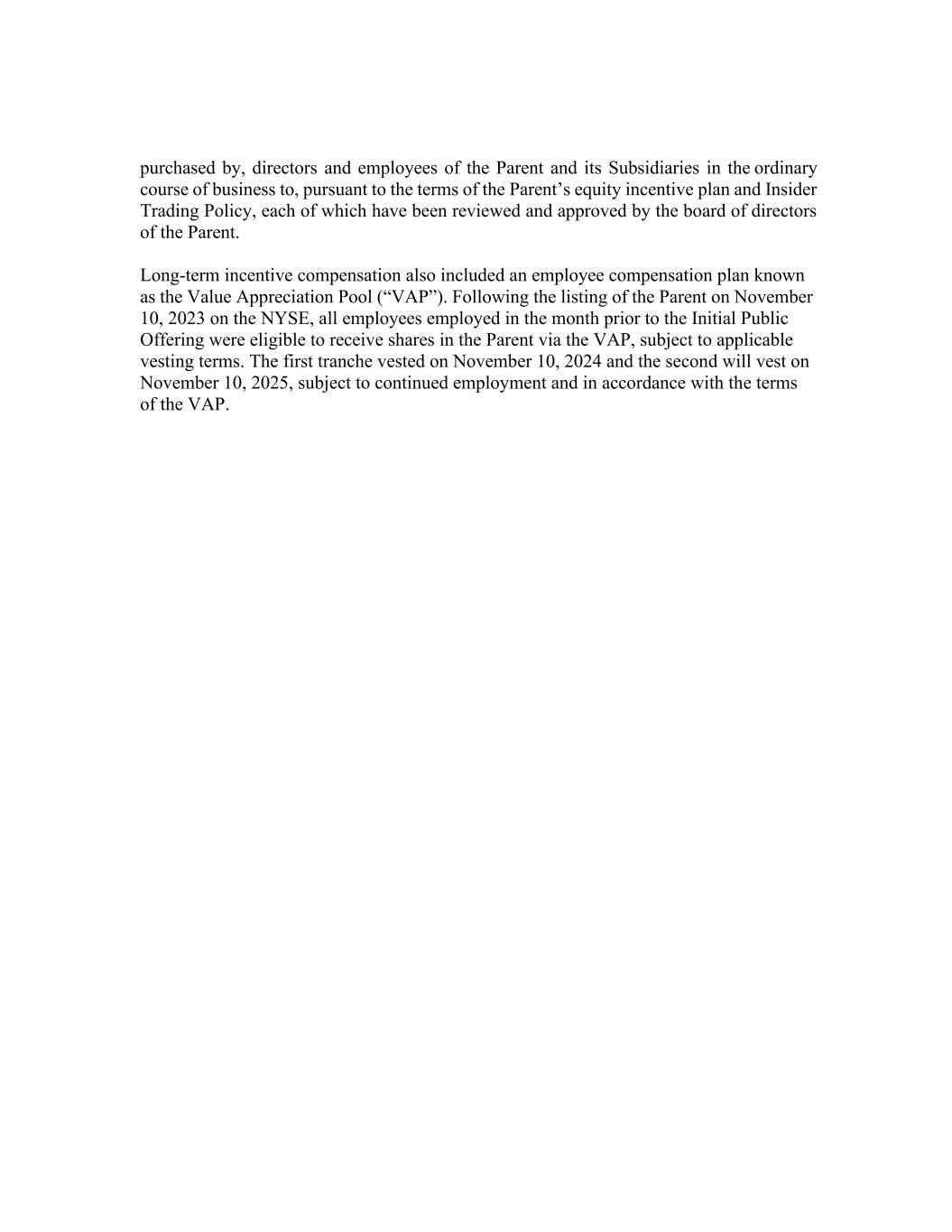 purchased by, directors and employees of the Parent and its Subsidiaries in the ordinary course of business to, pursuant to the terms of the Parent’s equity incentive plan and Insider Trading Policy, each of which have been reviewed and approved by the board of directors of the Parent. Long-term incentive compensation also included an employee compensation plan known as the Value Appreciation Pool (“VAP”). Following the listing of the Parent on November 10, 2023 on the NYSE, all employees employed in the month prior to the Initial Public Offering were eligible to receive shares in the Parent via the VAP, subject to applicable vesting terms. The first tranche vested on November 10, 2024 and the second will vest on November 10, 2025, subject to continued employment and in accordance with the terms of the VAP.