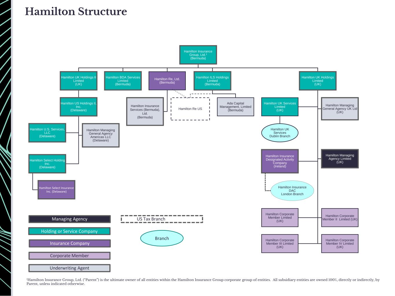 Hamilton Structure Hamilton Insurance Group, Ltd.1 (Bermuda) Hamilton UK Holdings II Limited (UK) Hamilton US Holdings II, Inc. (Delaware) Hamilton U.S. Services, LLC (Delaware) Hamilton Managing General Agency Americas LLC (Delaware) Hamilton Select Holding Inc. (Delaware) Hamilton Select Insurance Inc. (Delaware) Hamilton BDA Services Limited (Bermuda) Hamilton Re, Ltd. (Bermuda) Hamilton Insurance Services (Bermuda), Ltd. (Bermuda) Hamilton ILS Holdings Limited (Bermuda) Hamilton Re US Ada Capital Management, Limited (Bermuda) Hamilton UK Holdings Limited (UK) Hamilton UK Services Limited (UK) Hamilton UK Services Dublin Branch Hamilton Managing General Agency UK Ltd (UK) Hamilton Insurance Designated Activity Company (Ireland) Hamilton Insurance DAC London Branch Hamilton Managing Agency Limited (UK) Hamilton Corporate Member Limited (UK) Hamilton Corporate Member II Limited (UK) Hamilton Corporate Member III Limited (UK) Hamilton Corporate Member IV Limited (UK) Managing Agency Insurance Company Corporate Member Holding or Service Company Underwriting Agent 1Hamilton Insurance Group, Ltd. (“Parent”) is the ultimate owner of all entities within the Hamilton Insurance Group corporate group of entities. All subsidiary entities are owned 100%, directly or indirectly, by Parent, unless indicated otherwise. US Tax Branching Agency Branch