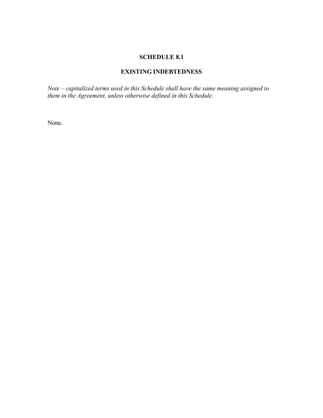 SCHEDULE 8.1 EXISTING INDEBTEDNESS Note – capitalized terms used in this Schedule shall have the same meaning assigned to them in the Agreement, unless otherwise defined in this Schedule. None.