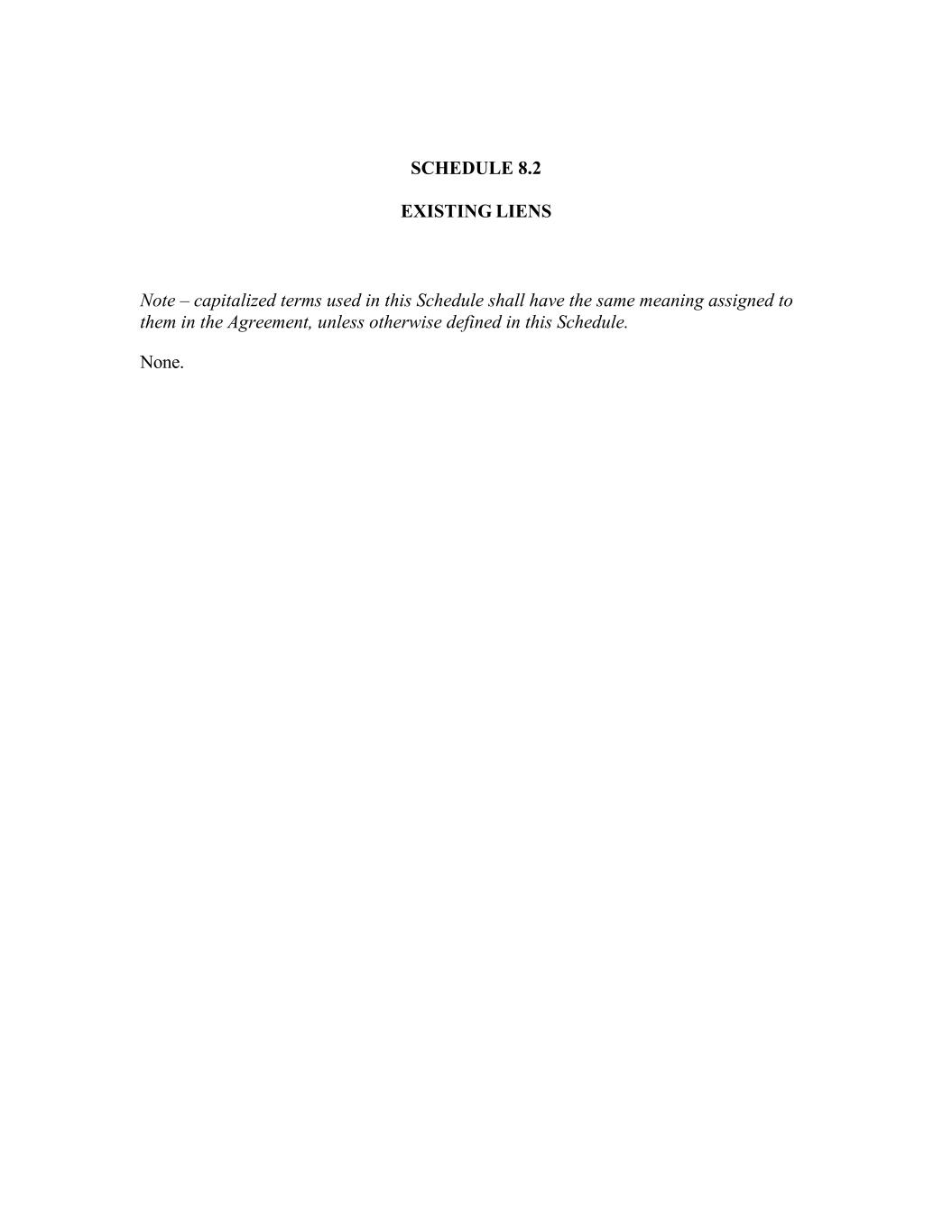 SCHEDULE 8.2 EXISTING LIENS Note – capitalized terms used in this Schedule shall have the same meaning assigned to them in the Agreement, unless otherwise defined in this Schedule. None.