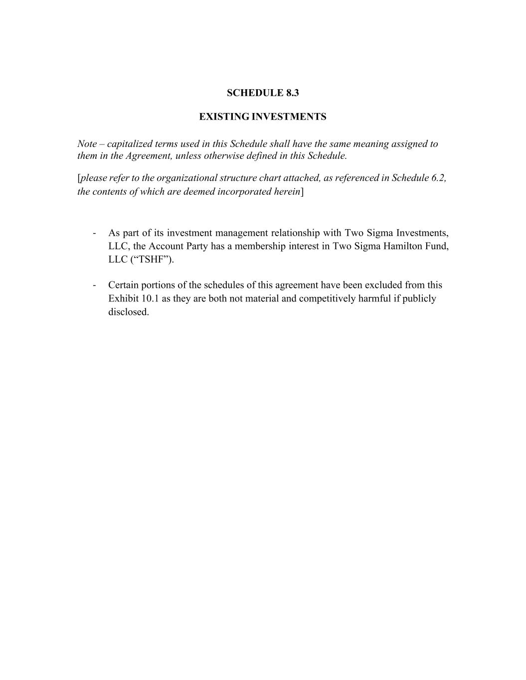 SCHEDULE 8.3 EXISTING INVESTMENTS Note – capitalized terms used in this Schedule shall have the same meaning assigned to them in the Agreement, unless otherwise defined in this Schedule. [please refer to the organizational structure chart attached, as referenced in Schedule 6.2, the contents of which are deemed incorporated herein] - As part of its investment management relationship with Two Sigma Investments, LLC, the Account Party has a membership interest in Two Sigma Hamilton Fund, LLC (“TSHF”). - Certain portions of the schedules of this agreement have been excluded from this Exhibit 10.1 as they are both not material and competitively harmful if publicly disclosed.