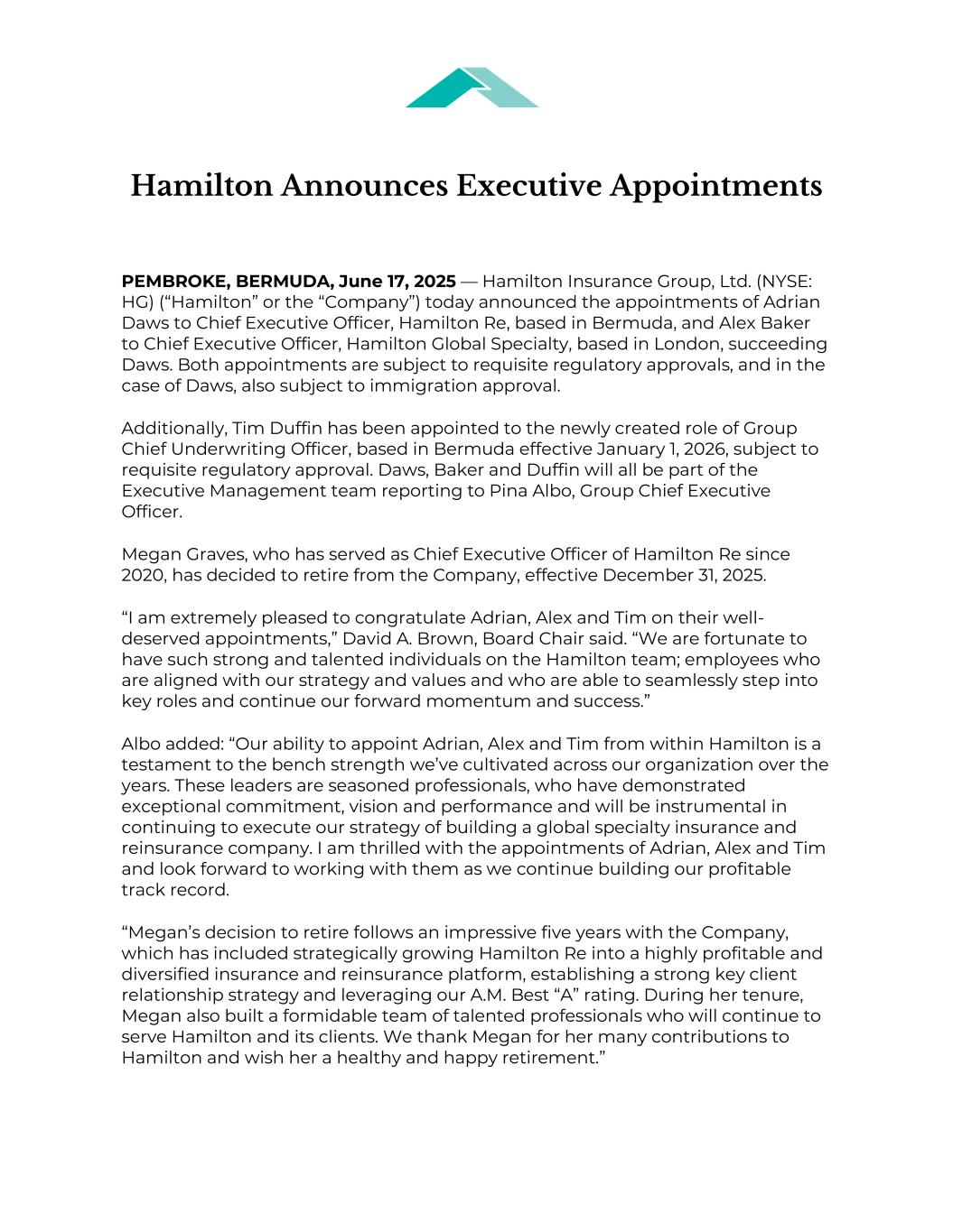 Hamilton Announces Executive Appointments PEMBROKE, BERMUDA, June 17, 2025 — Hamilton Insurance Group, Ltd. (NYSE: HG) (“Hamilton” or the “Company”) today announced the appointments of Adrian Daws to Chief Executive Officer, Hamilton Re, based in Bermuda, and Alex Baker to Chief Executive Officer, Hamilton Global Specialty, based in London, succeeding Daws. Both appointments are subject to requisite regulatory approvals, and in the case of Daws, also subject to immigration approval. Additionally, Tim Duffin has been appointed to the newly created role of Group Chief Underwriting Officer, based in Bermuda effective January 1, 2026, subject to requisite regulatory approval. Daws, Baker and Duffin will all be part of the Executive Management team reporting to Pina Albo, Group Chief Executive Officer. Megan Graves, who has served as Chief Executive Officer of Hamilton Re since 2020, has decided to retire from the Company, effective December 31, 2025. “I am extremely pleased to congratulate Adrian, Alex and Tim on their well- deserved appointments,” David A. Brown, Board Chair said. “We are fortunate to have such strong and talented individuals on the Hamilton team; employees who are aligned with our strategy and values and who are able to seamlessly step into key roles and continue our forward momentum and success.” Albo added: “Our ability to appoint Adrian, Alex and Tim from within Hamilton is a testament to the bench strength we’ve cultivated across our organization over the years. These leaders are seasoned professionals, who have demonstrated exceptional commitment, vision and performance and will be instrumental in continuing to execute our strategy of building a global specialty insurance and reinsurance company. I am thrilled with the appointments of Adrian, Alex and Tim and look forward to working with them as we continue building our profitable track record. “Megan’s decision to retire follows an impressive five years with the Company, which has included strategically growing Hamilton Re into a highly profitable and diversified insurance and reinsurance platform, establishing a strong key client relationship strategy and leveraging our A.M. Best “A” rating. During her tenure, Megan also built a formidable team of talented professionals who will continue to serve Hamilton and its clients. We thank Megan for her many contributions to Hamilton and wish her a healthy and happy retirement.”