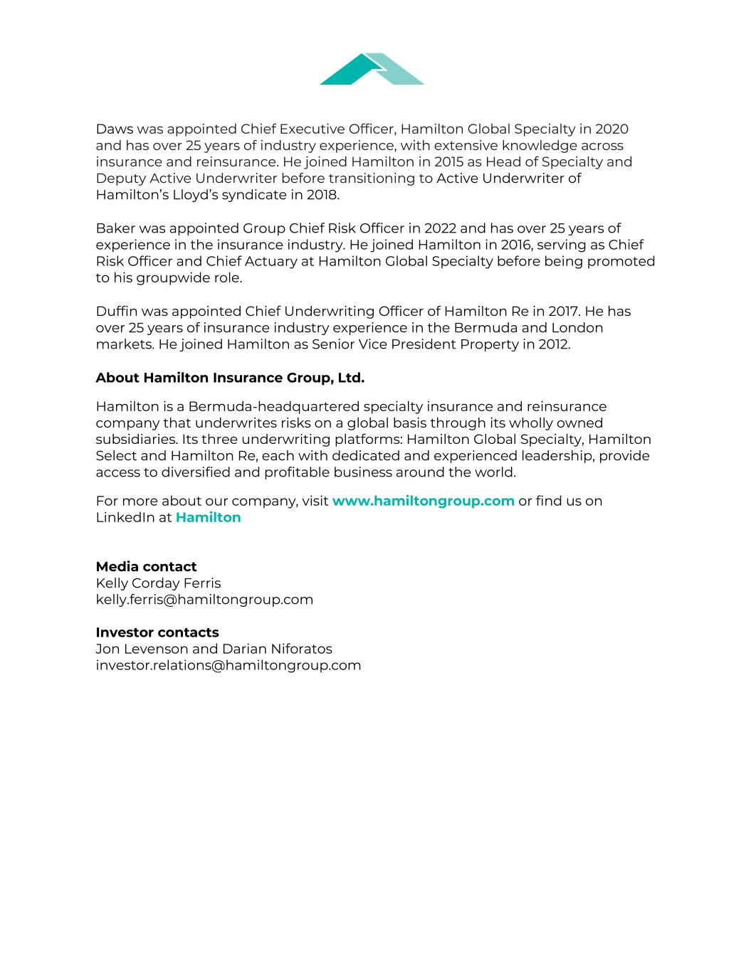 Daws was appointed Chief Executive Officer, Hamilton Global Specialty in 2020 and has over 25 years of industry experience, with extensive knowledge across insurance and reinsurance. He joined Hamilton in 2015 as Head of Specialty and Deputy Active Underwriter before transitioning to Active Underwriter of Hamilton’s Lloyd’s syndicate in 2018. Baker was appointed Group Chief Risk Officer in 2022 and has over 25 years of experience in the insurance industry. He joined Hamilton in 2016, serving as Chief Risk Officer and Chief Actuary at Hamilton Global Specialty before being promoted to his groupwide role. Duffin was appointed Chief Underwriting Officer of Hamilton Re in 2017. He has over 25 years of insurance industry experience in the Bermuda and London markets. He joined Hamilton as Senior Vice President Property in 2012. About Hamilton Insurance Group, Ltd. Hamilton is a Bermuda-headquartered specialty insurance and reinsurance company that underwrites risks on a global basis through its wholly owned subsidiaries. Its three underwriting platforms: Hamilton Global Specialty, Hamilton Select and Hamilton Re, each with dedicated and experienced leadership, provide access to diversified and profitable business around the world. For more about our company, visit www.hamiltongroup.com or find us on LinkedIn at Hamilton Media contact Kelly Corday Ferris kelly.ferris@hamiltongroup.com Investor contacts Jon Levenson and Darian Niforatos investor.relations@hamiltongroup.com