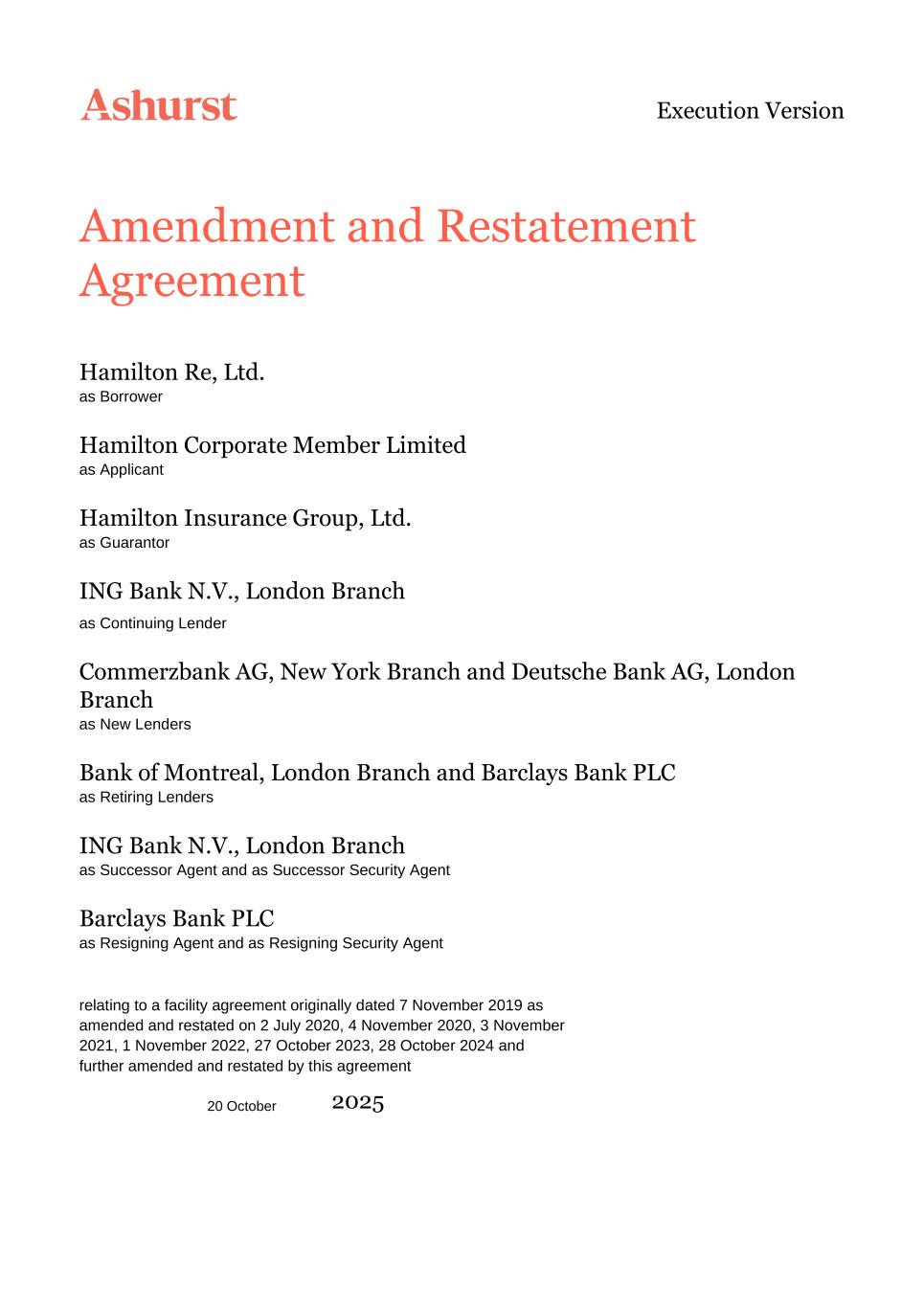 Execution Version Amendment and Restatement Agreement Hamilton Re, Ltd. as Borrower Hamilton Corporate Member Limited as Applicant Hamilton Insurance Group, Ltd. as Guarantor ING Bank N.V., London Branch as Continuing Lender Commerzbank AG, New York Branch and Deutsche Bank AG, London Branch as New Lenders Bank of Montreal, London Branch and Barclays Bank PLC as Retiring Lenders ING Bank N.V., London Branch as Successor Agent and as Successor Security Agent Barclays Bank PLC as Resigning Agent and as Resigning Security Agent relating to a facility agreement originally dated 7 November 2019 as amended and restated on 2 July 2020, 4 November 2020, 3 November 2021, 1 November 2022, 27 October 2023, 28 October 2024 and further amended and restated by this agreement 2025 20 October