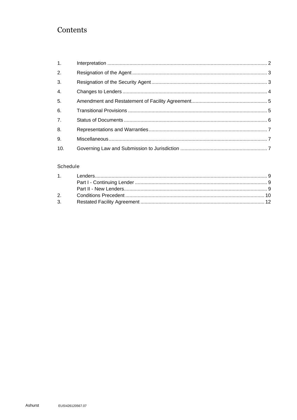 Ashurst EUS\426120567.07 Contents 1. Interpretation .................................................................................................................... 2 2. Resignation of the Agent .................................................................................................. 3 3. Resignation of the Security Agent .................................................................................... 3 4. Changes to Lenders ......................................................................................................... 4 5. Amendment and Restatement of Facility Agreement ....................................................... 5 6. Transitional Provisions ..................................................................................................... 5 7. Status of Documents ........................................................................................................ 6 8. Representations and Warranties ...................................................................................... 7 9. Miscellaneous ................................................................................................................... 7 10. Governing Law and Submission to Jurisdiction ............................................................... 7 Schedule 1. Lenders ............................................................................................................................. 9 Part I - Continuing Lender ................................................................................................ 9 Part II - New Lenders........................................................................................................ 9 2. Conditions Precedent ..................................................................................................... 10 3. Restated Facility Agreement .......................................................................................... 12