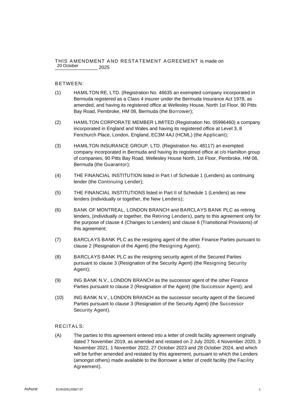 Ashurst EUS\426120567.07 1 THIS AMENDMENT AND RESTATEMENT AGREEMENT is made on ________________ 2025 BETWEEN: (1) HAMILTON RE, LTD. (Registration No. 46635 an exempted company incorporated in Bermuda registered as a Class 4 insurer under the Bermuda Insurance Act 1978, as amended, and having its registered office at Wellesley House, North 1st Floor, 90 Pitts Bay Road, Pembroke, HM 08, Bermuda (the Borrower); (2) HAMILTON CORPORATE MEMBER LIMITED (Registration No. 05996460) a company incorporated in England and Wales and having its registered office at Level 3, 8 Fenchurch Place, London, England, EC3M 4AJ (HCML) (the Applicant); (3) HAMILTON INSURANCE GROUP, LTD. (Registration No. 48117) an exempted company incorporated in Bermuda and having its registered office at c/o Hamilton group of companies, 90 Pitts Bay Road, Wellesley House North, 1st Floor, Pembroke, HM 08, Bermuda (the Guarantor); (4) THE FINANCIAL INSTITUTION listed in Part I of Schedule 1 (Lenders) as continuing lender (the Continuing Lender); (5) THE FINANCIAL INSTITUTIONS listed in Part II of Schedule 1 (Lenders) as new lenders (individually or together, the New Lenders); (6) BANK OF MONTREAL, LONDON BRANCH and BARCLAYS BANK PLC as retiring lenders, (individually or together, the Retiring Lenders), party to this agreement only for the purpose of clause 4 (Changes to Lenders) and clause 6 (Transitional Provisions) of this agreement; (7) BARCLAYS BANK PLC as the resigning agent of the other Finance Parties pursuant to clause 2 (Resignation of the Agent) (the Resigning Agent); (8) BARCLAYS BANK PLC as the resigning security agent of the Secured Parties pursuant to clause 3 (Resignation of the Security Agent) (the Resigning Security Agent); (9) ING BANK N.V., LONDON BRANCH as the successor agent of the other Finance Parties pursuant to clause 2 (Resignation of the Agent) (the Successor Agent); and (10) ING BANK N.V., LONDON BRANCH as the successor security agent of the Secured Parties pursuant to clause 3 (Resignation of the Security Agent) (the Successor Security Agent). RECITALS: (A) The parties to this agreement entered into a letter of credit facility agreement originally dated 7 November 2019, as amended and restated on 2 July 2020, 4 November 2020, 3 November 2021, 1 November 2022, 27 October 2023 and 28 October 2024, and which will be further amended and restated by this agreement, pursuant to which the Lenders (amongst others) made available to the Borrower a letter of credit facility (the Facility Agreement). 20 October