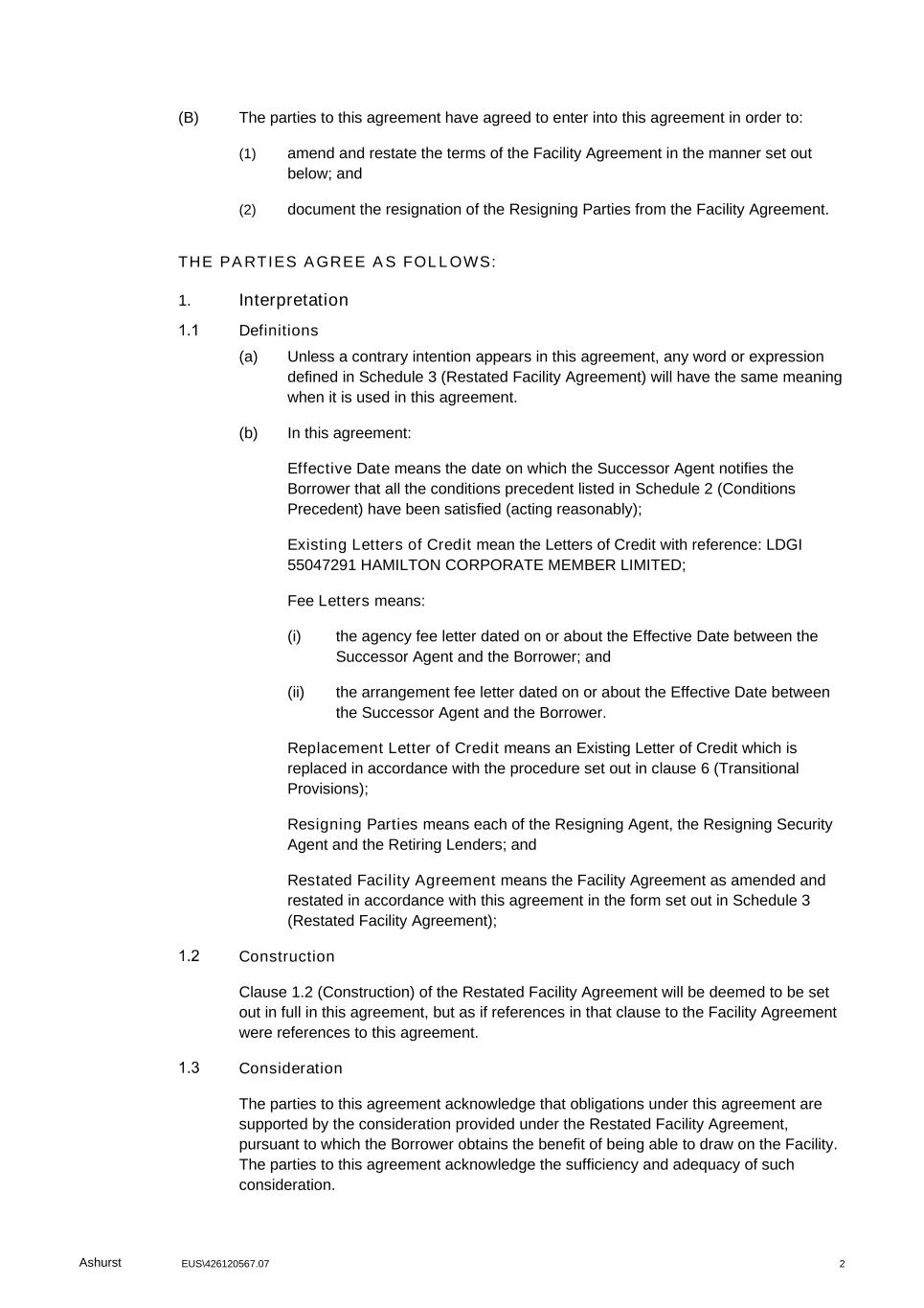 Ashurst EUS\426120567.07 2 (B) The parties to this agreement have agreed to enter into this agreement in order to: (1) amend and restate the terms of the Facility Agreement in the manner set out below; and (2) document the resignation of the Resigning Parties from the Facility Agreement. THE PARTIES AGREE AS FOLLOWS: 1. Interpretation Definitions (a) Unless a contrary intention appears in this agreement, any word or expression defined in Schedule 3 (Restated Facility Agreement) will have the same meaning when it is used in this agreement. (b) In this agreement: Effective Date means the date on which the Successor Agent notifies the Borrower that all the conditions precedent listed in Schedule 2 (Conditions Precedent) have been satisfied (acting reasonably); Existing Letters of Credit mean the Letters of Credit with reference: LDGI 55047291 HAMILTON CORPORATE MEMBER LIMITED; Fee Letters means: (i) the agency fee letter dated on or about the Effective Date between the Successor Agent and the Borrower; and (ii) the arrangement fee letter dated on or about the Effective Date between the Successor Agent and the Borrower. Replacement Letter of Credit means an Existing Letter of Credit which is replaced in accordance with the procedure set out in clause 6 (Transitional Provisions); Resigning Parties means each of the Resigning Agent, the Resigning Security Agent and the Retiring Lenders; and Restated Facility Agreement means the Facility Agreement as amended and restated in accordance with this agreement in the form set out in Schedule 3 (Restated Facility Agreement); Construction Clause 1.2 (Construction) of the Restated Facility Agreement will be deemed to be set out in full in this agreement, but as if references in that clause to the Facility Agreement were references to this agreement. Consideration The parties to this agreement acknowledge that obligations under this agreement are supported by the consideration provided under the Restated Facility Agreement, pursuant to which the Borrower obtains the benefit of being able to draw on the Facility. The parties to this agreement acknowledge the sufficiency and adequacy of such consideration.