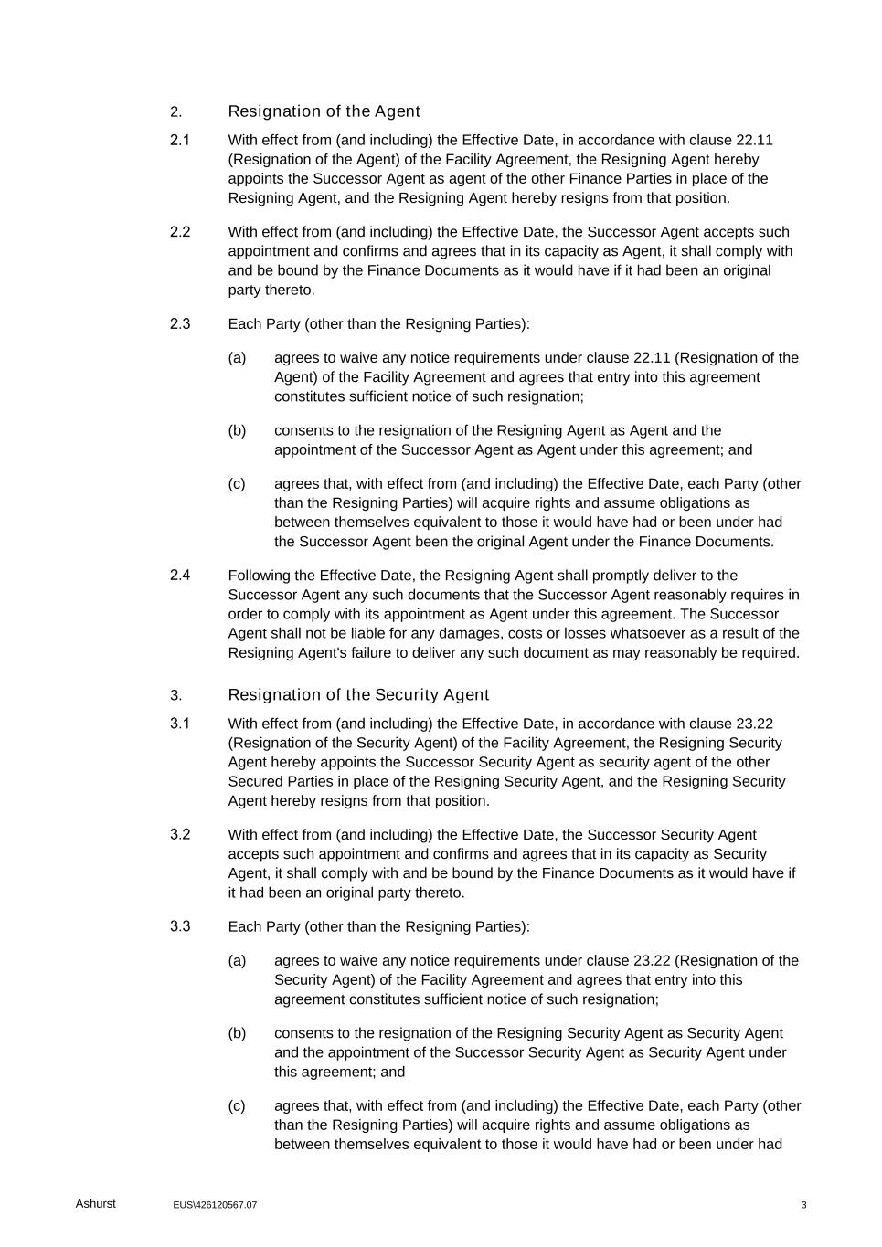 Ashurst EUS\426120567.07 3 2. Resignation of the Agent With effect from (and including) the Effective Date, in accordance with clause 22.11 (Resignation of the Agent) of the Facility Agreement, the Resigning Agent hereby appoints the Successor Agent as agent of the other Finance Parties in place of the Resigning Agent, and the Resigning Agent hereby resigns from that position. With effect from (and including) the Effective Date, the Successor Agent accepts such appointment and confirms and agrees that in its capacity as Agent, it shall comply with and be bound by the Finance Documents as it would have if it had been an original party thereto. Each Party (other than the Resigning Parties): (a) agrees to waive any notice requirements under clause 22.11 (Resignation of the Agent) of the Facility Agreement and agrees that entry into this agreement constitutes sufficient notice of such resignation; (b) consents to the resignation of the Resigning Agent as Agent and the appointment of the Successor Agent as Agent under this agreement; and (c) agrees that, with effect from (and including) the Effective Date, each Party (other than the Resigning Parties) will acquire rights and assume obligations as between themselves equivalent to those it would have had or been under had the Successor Agent been the original Agent under the Finance Documents. Following the Effective Date, the Resigning Agent shall promptly deliver to the Successor Agent any such documents that the Successor Agent reasonably requires in order to comply with its appointment as Agent under this agreement. The Successor Agent shall not be liable for any damages, costs or losses whatsoever as a result of the Resigning Agent's failure to deliver any such document as may reasonably be required. 3. Resignation of the Security Agent With effect from (and including) the Effective Date, in accordance with clause 23.22 (Resignation of the Security Agent) of the Facility Agreement, the Resigning Security Agent hereby appoints the Successor Security Agent as security agent of the other Secured Parties in place of the Resigning Security Agent, and the Resigning Security Agent hereby resigns from that position. With effect from (and including) the Effective Date, the Successor Security Agent accepts such appointment and confirms and agrees that in its capacity as Security Agent, it shall comply with and be bound by the Finance Documents as it would have if it had been an original party thereto. Each Party (other than the Resigning Parties): (a) agrees to waive any notice requirements under clause 23.22 (Resignation of the Security Agent) of the Facility Agreement and agrees that entry into this agreement constitutes sufficient notice of such resignation; (b) consents to the resignation of the Resigning Security Agent as Security Agent and the appointment of the Successor Security Agent as Security Agent under this agreement; and (c) agrees that, with effect from (and including) the Effective Date, each Party (other than the Resigning Parties) will acquire rights and assume obligations as between themselves equivalent to those it would have had or been under had