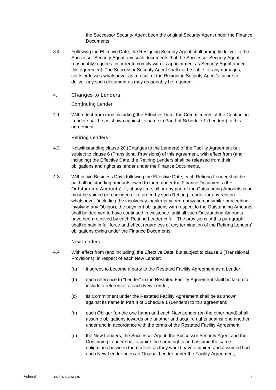 Ashurst EUS\426120567.07 4 the Successor Security Agent been the original Security Agent under the Finance Documents. Following the Effective Date, the Resigning Security Agent shall promptly deliver to the Successor Security Agent any such documents that the Successor Security Agent reasonably requires in order to comply with its appointment as Security Agent under this agreement. The Successor Security Agent shall not be liable for any damages, costs or losses whatsoever as a result of the Resigning Security Agent's failure to deliver any such document as may reasonably be required. 4. Changes to Lenders Continuing Lender With effect from (and including) the Effective Date, the Commitments of the Continuing Lender shall be as shown against its name in Part I of Schedule 1 (Lenders) to this agreement. Retiring Lenders Notwithstanding clause 20 (Changes to the Lenders) of the Facility Agreement but subject to clause 6 (Transitional Provisions) of this agreement, with effect from (and including) the Effective Date, the Retiring Lenders shall be released from their obligations and rights as lender under the Finance Documents. Within five Business Days following the Effective Date, each Retiring Lender shall be paid all outstanding amounts owed to them under the Finance Documents (the Outstanding Amounts). If, at any time, all or any part of the Outstanding Amounts is or must be voided or rescinded or returned by such Retiring Lender for any reason whatsoever (including the insolvency, bankruptcy, reorganization or similar proceeding involving any Obligor), the payment obligations with respect to the Outstanding Amounts shall be deemed to have continued in existence, until all such Outstanding Amounts have been received by each Retiring Lender in full. The provisions of this paragraph shall remain in full force and effect regardless of any termination of the Retiring Lenders' obligations owing under the Finance Documents. New Lenders With effect from (and including) the Effective Date, but subject to clause 6 (Transitional Provisions), in respect of each New Lender: (a) it agrees to become a party to the Restated Facility Agreement as a Lender; (b) each reference to "Lender" in the Restated Facility Agreement shall be taken to include a reference to each New Lender; (c) its Commitment under the Restated Facility Agreement shall be as shown against its name in Part II of Schedule 1 (Lenders) to this agreement; (d) each Obligor (on the one hand) and each New Lender (on the other hand) shall assume obligations towards one another and acquire rights against one another under and in accordance with the terms of the Restated Facility Agreement; (e) the New Lenders, the Successor Agent, the Successor Security Agent and the Continuing Lender shall acquire the same rights and assume the same obligations between themselves as they would have acquired and assumed had each New Lender been an Original Lender under the Facility Agreement;
