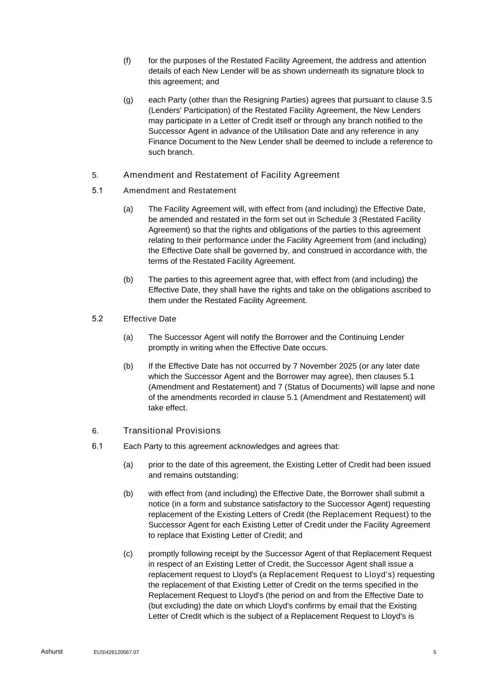 Ashurst EUS\426120567.07 5 (f) for the purposes of the Restated Facility Agreement, the address and attention details of each New Lender will be as shown underneath its signature block to this agreement; and (g) each Party (other than the Resigning Parties) agrees that pursuant to clause 3.5 (Lenders' Participation) of the Restated Facility Agreement, the New Lenders may participate in a Letter of Credit itself or through any branch notified to the Successor Agent in advance of the Utilisation Date and any reference in any Finance Document to the New Lender shall be deemed to include a reference to such branch. 5. Amendment and Restatement of Facility Agreement Amendment and Restatement (a) The Facility Agreement will, with effect from (and including) the Effective Date, be amended and restated in the form set out in Schedule 3 (Restated Facility Agreement) so that the rights and obligations of the parties to this agreement relating to their performance under the Facility Agreement from (and including) the Effective Date shall be governed by, and construed in accordance with, the terms of the Restated Facility Agreement. (b) The parties to this agreement agree that, with effect from (and including) the Effective Date, they shall have the rights and take on the obligations ascribed to them under the Restated Facility Agreement. Effective Date (a) The Successor Agent will notify the Borrower and the Continuing Lender promptly in writing when the Effective Date occurs. (b) If the Effective Date has not occurred by 7 November 2025 (or any later date which the Successor Agent and the Borrower may agree), then clauses 5.1 (Amendment and Restatement) and 7 (Status of Documents) will lapse and none of the amendments recorded in clause 5.1 (Amendment and Restatement) will take effect. 6. Transitional Provisions Each Party to this agreement acknowledges and agrees that: (a) prior to the date of this agreement, the Existing Letter of Credit had been issued and remains outstanding; (b) with effect from (and including) the Effective Date, the Borrower shall submit a notice (in a form and substance satisfactory to the Successor Agent) requesting replacement of the Existing Letters of Credit (the Replacement Request) to the Successor Agent for each Existing Letter of Credit under the Facility Agreement to replace that Existing Letter of Credit; and (c) promptly following receipt by the Successor Agent of that Replacement Request in respect of an Existing Letter of Credit, the Successor Agent shall issue a replacement request to Lloyd's (a Replacement Request to Lloyd's) requesting the replacement of that Existing Letter of Credit on the terms specified in the Replacement Request to Lloyd's (the period on and from the Effective Date to (but excluding) the date on which Lloyd's confirms by email that the Existing Letter of Credit which is the subject of a Replacement Request to Lloyd's is