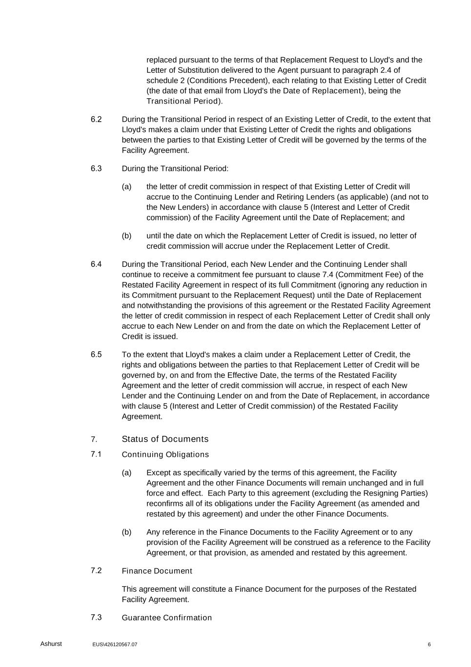 Ashurst EUS\426120567.07 6 replaced pursuant to the terms of that Replacement Request to Lloyd's and the Letter of Substitution delivered to the Agent pursuant to paragraph 2.4 of schedule 2 (Conditions Precedent), each relating to that Existing Letter of Credit (the date of that email from Lloyd's the Date of Replacement), being the Transitional Period). During the Transitional Period in respect of an Existing Letter of Credit, to the extent that Lloyd's makes a claim under that Existing Letter of Credit the rights and obligations between the parties to that Existing Letter of Credit will be governed by the terms of the Facility Agreement. During the Transitional Period: (a) the letter of credit commission in respect of that Existing Letter of Credit will accrue to the Continuing Lender and Retiring Lenders (as applicable) (and not to the New Lenders) in accordance with clause 5 (Interest and Letter of Credit commission) of the Facility Agreement until the Date of Replacement; and (b) until the date on which the Replacement Letter of Credit is issued, no letter of credit commission will accrue under the Replacement Letter of Credit. During the Transitional Period, each New Lender and the Continuing Lender shall continue to receive a commitment fee pursuant to clause 7.4 (Commitment Fee) of the Restated Facility Agreement in respect of its full Commitment (ignoring any reduction in its Commitment pursuant to the Replacement Request) until the Date of Replacement and notwithstanding the provisions of this agreement or the Restated Facility Agreement the letter of credit commission in respect of each Replacement Letter of Credit shall only accrue to each New Lender on and from the date on which the Replacement Letter of Credit is issued. To the extent that Lloyd's makes a claim under a Replacement Letter of Credit, the rights and obligations between the parties to that Replacement Letter of Credit will be governed by, on and from the Effective Date, the terms of the Restated Facility Agreement and the letter of credit commission will accrue, in respect of each New Lender and the Continuing Lender on and from the Date of Replacement, in accordance with clause 5 (Interest and Letter of Credit commission) of the Restated Facility Agreement. 7. Status of Documents Continuing Obligations (a) Except as specifically varied by the terms of this agreement, the Facility Agreement and the other Finance Documents will remain unchanged and in full force and effect. Each Party to this agreement (excluding the Resigning Parties) reconfirms all of its obligations under the Facility Agreement (as amended and restated by this agreement) and under the other Finance Documents. (b) Any reference in the Finance Documents to the Facility Agreement or to any provision of the Facility Agreement will be construed as a reference to the Facility Agreement, or that provision, as amended and restated by this agreement. Finance Document This agreement will constitute a Finance Document for the purposes of the Restated Facility Agreement. Guarantee Confirmation