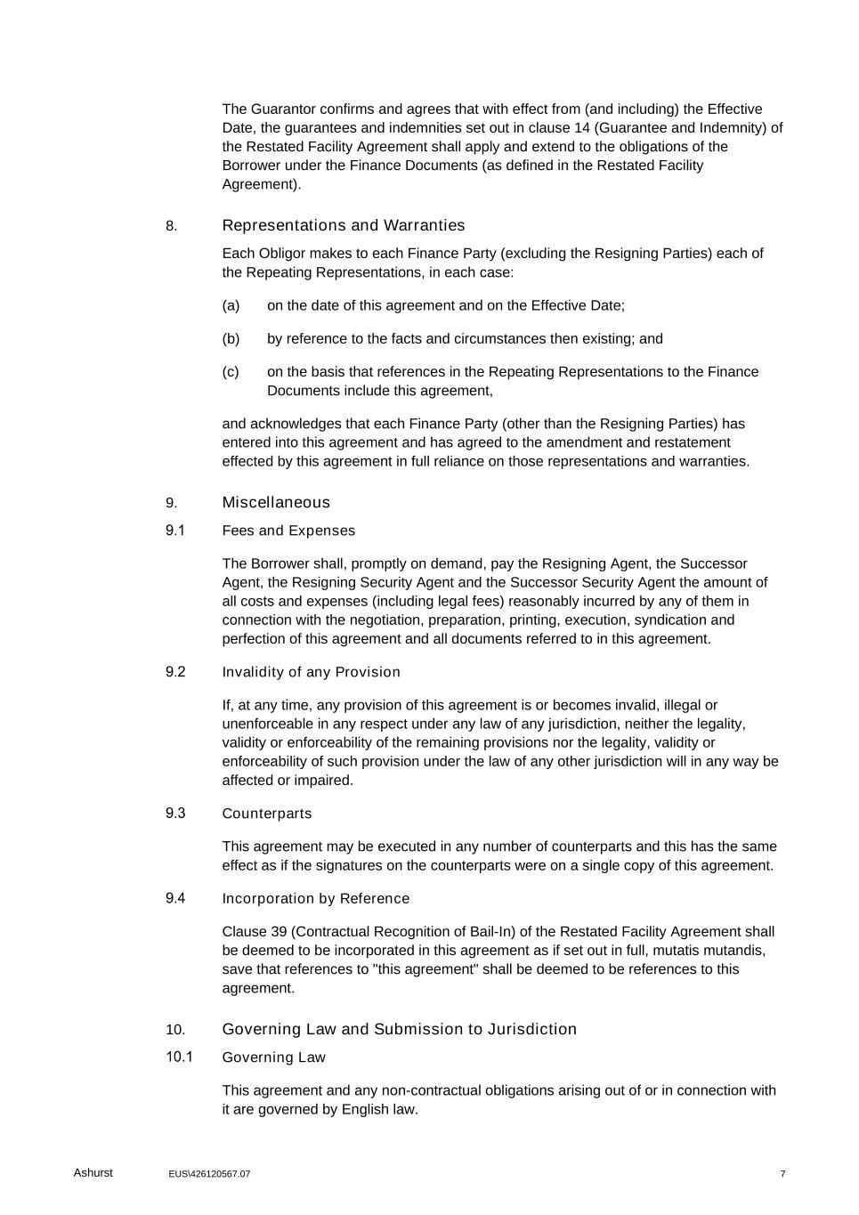 Ashurst EUS\426120567.07 7 The Guarantor confirms and agrees that with effect from (and including) the Effective Date, the guarantees and indemnities set out in clause 14 (Guarantee and Indemnity) of the Restated Facility Agreement shall apply and extend to the obligations of the Borrower under the Finance Documents (as defined in the Restated Facility Agreement). 8. Representations and Warranties Each Obligor makes to each Finance Party (excluding the Resigning Parties) each of the Repeating Representations, in each case: (a) on the date of this agreement and on the Effective Date; (b) by reference to the facts and circumstances then existing; and (c) on the basis that references in the Repeating Representations to the Finance Documents include this agreement, and acknowledges that each Finance Party (other than the Resigning Parties) has entered into this agreement and has agreed to the amendment and restatement effected by this agreement in full reliance on those representations and warranties. 9. Miscellaneous Fees and Expenses The Borrower shall, promptly on demand, pay the Resigning Agent, the Successor Agent, the Resigning Security Agent and the Successor Security Agent the amount of all costs and expenses (including legal fees) reasonably incurred by any of them in connection with the negotiation, preparation, printing, execution, syndication and perfection of this agreement and all documents referred to in this agreement. Invalidity of any Provision If, at any time, any provision of this agreement is or becomes invalid, illegal or unenforceable in any respect under any law of any jurisdiction, neither the legality, validity or enforceability of the remaining provisions nor the legality, validity or enforceability of such provision under the law of any other jurisdiction will in any way be affected or impaired. Counterparts This agreement may be executed in any number of counterparts and this has the same effect as if the signatures on the counterparts were on a single copy of this agreement. Incorporation by Reference Clause 39 (Contractual Recognition of Bail-In) of the Restated Facility Agreement shall be deemed to be incorporated in this agreement as if set out in full, mutatis mutandis, save that references to "this agreement" shall be deemed to be references to this agreement. 10. Governing Law and Submission to Jurisdiction Governing Law This agreement and any non-contractual obligations arising out of or in connection with it are governed by English law.