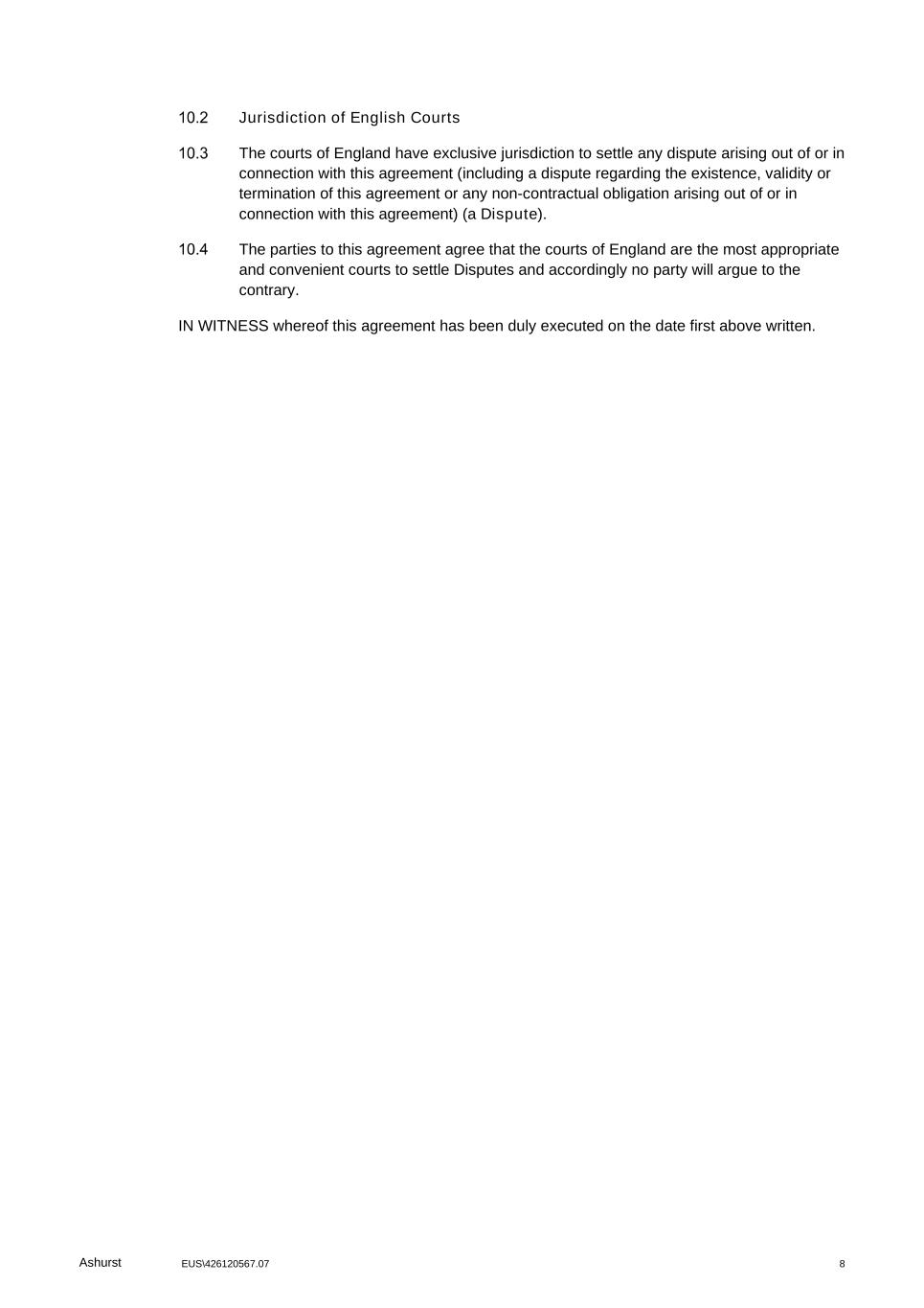 Ashurst EUS\426120567.07 8 Jurisdiction of English Courts The courts of England have exclusive jurisdiction to settle any dispute arising out of or in connection with this agreement (including a dispute regarding the existence, validity or termination of this agreement or any non-contractual obligation arising out of or in connection with this agreement) (a Dispute). The parties to this agreement agree that the courts of England are the most appropriate and convenient courts to settle Disputes and accordingly no party will argue to the contrary. IN WITNESS whereof this agreement has been duly executed on the date first above written.