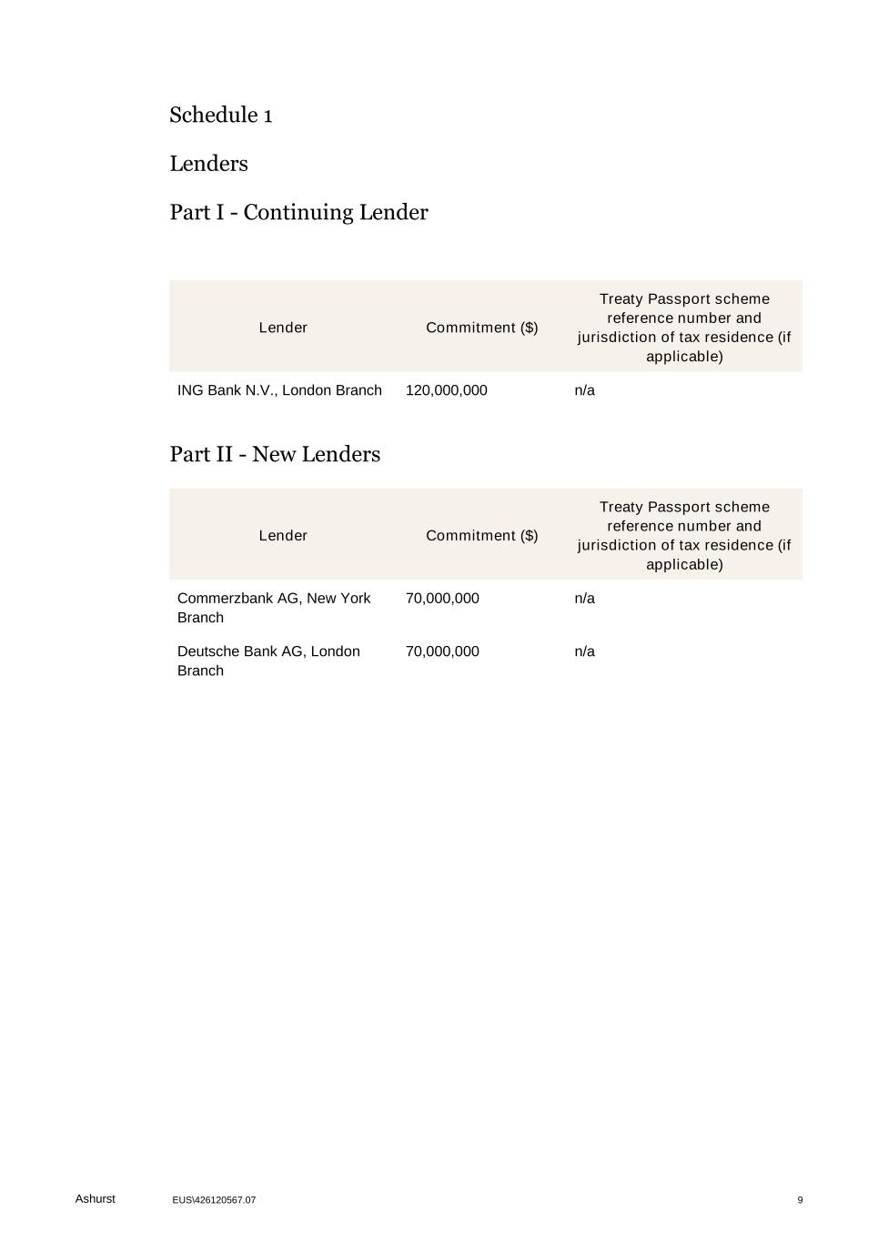Ashurst EUS\426120567.07 9 Schedule 1 Lenders Part I - Continuing Lender Lender Commitment ($) Treaty Passport scheme reference number and jurisdiction of tax residence (if applicable) ING Bank N.V., London Branch 120,000,000 n/a Part II - New Lenders Lender Commitment ($) Treaty Passport scheme reference number and jurisdiction of tax residence (if applicable) Commerzbank AG, New York Branch 70,000,000 n/a Deutsche Bank AG, London Branch 70,000,000 n/a