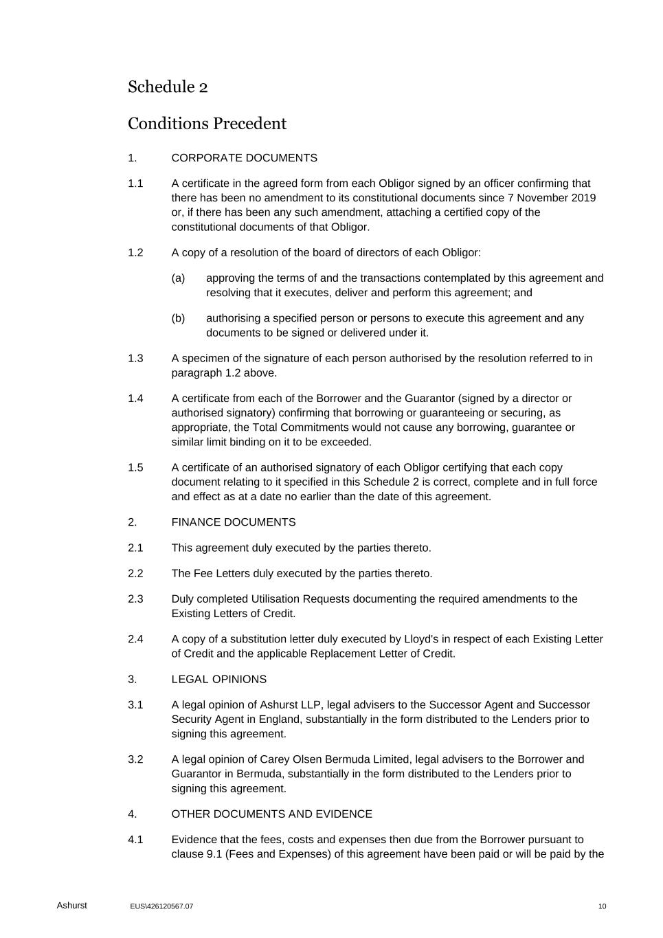 Ashurst EUS\426120567.07 10 Schedule 2 Conditions Precedent 1. CORPORATE DOCUMENTS 1.1 A certificate in the agreed form from each Obligor signed by an officer confirming that there has been no amendment to its constitutional documents since 7 November 2019 or, if there has been any such amendment, attaching a certified copy of the constitutional documents of that Obligor. 1.2 A copy of a resolution of the board of directors of each Obligor: (a) approving the terms of and the transactions contemplated by this agreement and resolving that it executes, deliver and perform this agreement; and (b) authorising a specified person or persons to execute this agreement and any documents to be signed or delivered under it. 1.3 A specimen of the signature of each person authorised by the resolution referred to in paragraph 1.2 above. 1.4 A certificate from each of the Borrower and the Guarantor (signed by a director or authorised signatory) confirming that borrowing or guaranteeing or securing, as appropriate, the Total Commitments would not cause any borrowing, guarantee or similar limit binding on it to be exceeded. 1.5 A certificate of an authorised signatory of each Obligor certifying that each copy document relating to it specified in this Schedule 2 is correct, complete and in full force and effect as at a date no earlier than the date of this agreement. 2. FINANCE DOCUMENTS 2.1 This agreement duly executed by the parties thereto. 2.2 The Fee Letters duly executed by the parties thereto. 2.3 Duly completed Utilisation Requests documenting the required amendments to the Existing Letters of Credit. 2.4 A copy of a substitution letter duly executed by Lloyd's in respect of each Existing Letter of Credit and the applicable Replacement Letter of Credit. 3. LEGAL OPINIONS 3.1 A legal opinion of Ashurst LLP, legal advisers to the Successor Agent and Successor Security Agent in England, substantially in the form distributed to the Lenders prior to signing this agreement. 3.2 A legal opinion of Carey Olsen Bermuda Limited, legal advisers to the Borrower and Guarantor in Bermuda, substantially in the form distributed to the Lenders prior to signing this agreement. 4. OTHER DOCUMENTS AND EVIDENCE 4.1 Evidence that the fees, costs and expenses then due from the Borrower pursuant to clause 9.1 (Fees and Expenses) of this agreement have been paid or will be paid by the