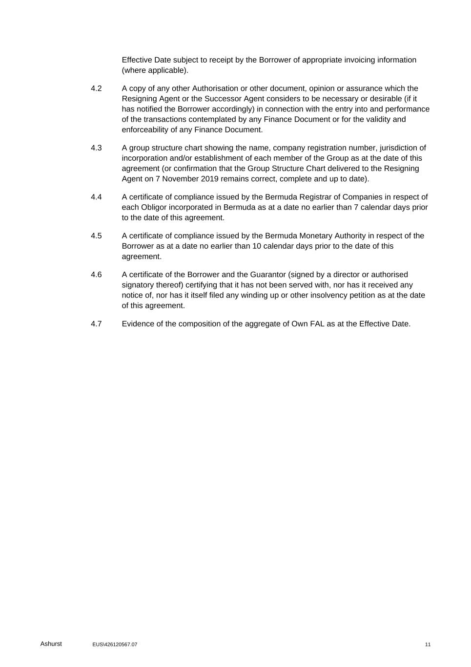 Ashurst EUS\426120567.07 11 Effective Date subject to receipt by the Borrower of appropriate invoicing information (where applicable). 4.2 A copy of any other Authorisation or other document, opinion or assurance which the Resigning Agent or the Successor Agent considers to be necessary or desirable (if it has notified the Borrower accordingly) in connection with the entry into and performance of the transactions contemplated by any Finance Document or for the validity and enforceability of any Finance Document. 4.3 A group structure chart showing the name, company registration number, jurisdiction of incorporation and/or establishment of each member of the Group as at the date of this agreement (or confirmation that the Group Structure Chart delivered to the Resigning Agent on 7 November 2019 remains correct, complete and up to date). 4.4 A certificate of compliance issued by the Bermuda Registrar of Companies in respect of each Obligor incorporated in Bermuda as at a date no earlier than 7 calendar days prior to the date of this agreement. 4.5 A certificate of compliance issued by the Bermuda Monetary Authority in respect of the Borrower as at a date no earlier than 10 calendar days prior to the date of this agreement. 4.6 A certificate of the Borrower and the Guarantor (signed by a director or authorised signatory thereof) certifying that it has not been served with, nor has it received any notice of, nor has it itself filed any winding up or other insolvency petition as at the date of this agreement. 4.7 Evidence of the composition of the aggregate of Own FAL as at the Effective Date.