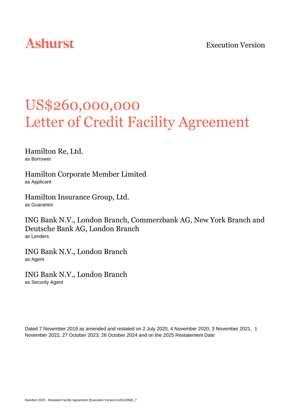 Hamilton 2025 - Restated Facility Agreement (Execution Version):426120568_7 Execution Version US$260,000,000 Letter of Credit Facility Agreement Hamilton Re, Ltd. as Borrower Hamilton Corporate Member Limited as Applicant Hamilton Insurance Group, Ltd. as Guarantor ING Bank N.V., London Branch, Commerzbank AG, New York Branch and Deutsche Bank AG, London Branch as Lenders ING Bank N.V., London Branch as Agent ING Bank N.V., London Branch as Security Agent Dated 7 November 2019 as amended and restated on 2 July 2020, 4 November 2020, 3 November 2021, 1 November 2022, 27 October 2023, 28 October 2024 and on the 2025 Restatement Date