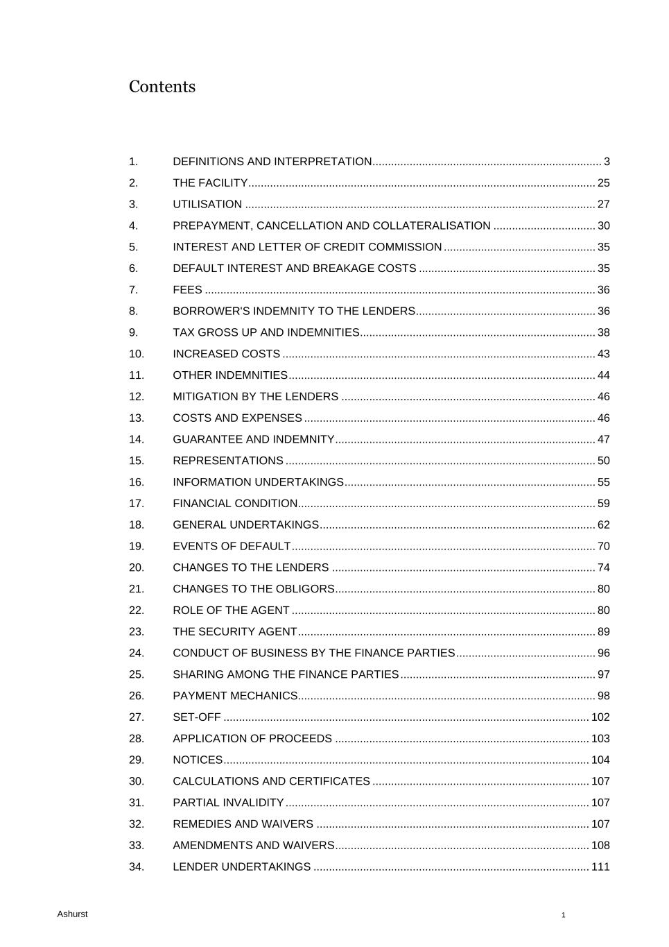 Ashurst 1 Contents 1. DEFINITIONS AND INTERPRETATION .......................................................................... 3 2. THE FACILITY ................................................................................................................ 25 3. UTILISATION ................................................................................................................. 27 4. PREPAYMENT, CANCELLATION AND COLLATERALISATION ................................. 30 5. INTEREST AND LETTER OF CREDIT COMMISSION ................................................. 35 6. DEFAULT INTEREST AND BREAKAGE COSTS ......................................................... 35 7. FEES .............................................................................................................................. 36 8. BORROWER'S INDEMNITY TO THE LENDERS .......................................................... 36 9. TAX GROSS UP AND INDEMNITIES ............................................................................ 38 10. INCREASED COSTS ..................................................................................................... 43 11. OTHER INDEMNITIES ................................................................................................... 44 12. MITIGATION BY THE LENDERS .................................................................................. 46 13. COSTS AND EXPENSES .............................................................................................. 46 14. GUARANTEE AND INDEMNITY .................................................................................... 47 15. REPRESENTATIONS .................................................................................................... 50 16. INFORMATION UNDERTAKINGS ................................................................................. 55 17. FINANCIAL CONDITION................................................................................................ 59 18. GENERAL UNDERTAKINGS ......................................................................................... 62 19. EVENTS OF DEFAULT .................................................................................................. 70 20. CHANGES TO THE LENDERS ..................................................................................... 74 21. CHANGES TO THE OBLIGORS .................................................................................... 80 22. ROLE OF THE AGENT .................................................................................................. 80 23. THE SECURITY AGENT ................................................................................................ 89 24. CONDUCT OF BUSINESS BY THE FINANCE PARTIES ............................................. 96 25. SHARING AMONG THE FINANCE PARTIES ............................................................... 97 26. PAYMENT MECHANICS................................................................................................ 98 27. SET-OFF ...................................................................................................................... 102 28. APPLICATION OF PROCEEDS .................................................................................. 103 29. NOTICES ...................................................................................................................... 104 30. CALCULATIONS AND CERTIFICATES ...................................................................... 107 31. PARTIAL INVALIDITY .................................................................................................. 107 32. REMEDIES AND WAIVERS ........................................................................................ 107 33. AMENDMENTS AND WAIVERS .................................................................................. 108 34. LENDER UNDERTAKINGS ......................................................................................... 111