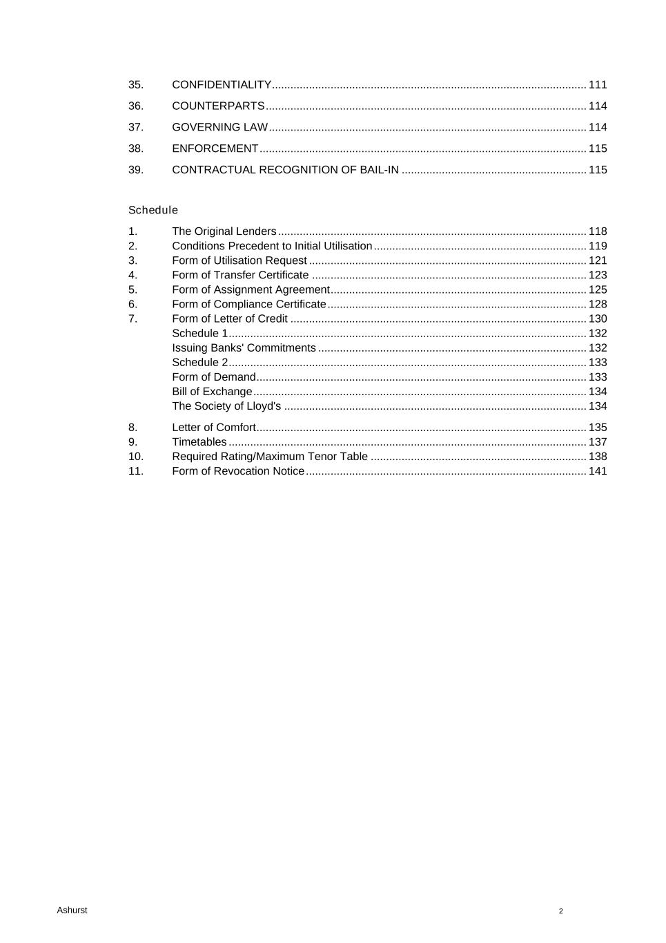Ashurst 2 35. CONFIDENTIALITY ...................................................................................................... 111 36. COUNTERPARTS ........................................................................................................ 114 37. GOVERNING LAW ....................................................................................................... 114 38. ENFORCEMENT .......................................................................................................... 115 39. CONTRACTUAL RECOGNITION OF BAIL-IN ............................................................ 115 Schedule 1. The Original Lenders .................................................................................................... 118 2. Conditions Precedent to Initial Utilisation ..................................................................... 119 3. Form of Utilisation Request .......................................................................................... 121 4. Form of Transfer Certificate ......................................................................................... 123 5. Form of Assignment Agreement ................................................................................... 125 6. Form of Compliance Certificate .................................................................................... 128 7. Form of Letter of Credit ................................................................................................ 130 Schedule 1 .................................................................................................................... 132 Issuing Banks' Commitments ....................................................................................... 132 Schedule 2 .................................................................................................................... 133 Form of Demand ........................................................................................................... 133 Bill of Exchange ............................................................................................................ 134 The Society of Lloyd's .................................................................................................. 134 8. Letter of Comfort ........................................................................................................... 135 9. Timetables .................................................................................................................... 137 10. Required Rating/Maximum Tenor Table ...................................................................... 138 11. Form of Revocation Notice ........................................................................................... 141