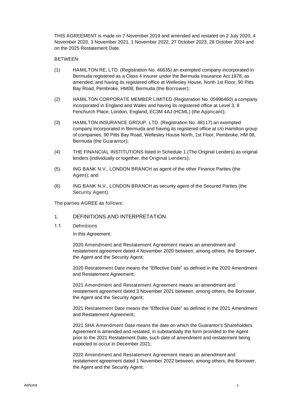 Ashurst 3 THIS AGREEMENT is made on 7 November 2019 and amended and restated on 2 July 2020, 4 November 2020, 3 November 2021, 1 November 2022, 27 October 2023, 28 October 2024 and on the 2025 Restatement Date. BETWEEN: (1) HAMILTON RE, LTD. (Registration No. 46635) an exempted company incorporated in Bermuda registered as a Class 4 insurer under the Bermuda Insurance Act 1978, as amended, and having its registered office at Wellesley House, North 1st Floor, 90 Pitts Bay Road, Pembroke, HM08, Bermuda (the Borrower); (2) HAMILTON CORPORATE MEMBER LIMITED (Registration No. 05996460) a company incorporated in England and Wales and having its registered office at Level 3, 8 Fenchurch Place, London, England, EC3M 4AJ (HCML) (the Applicant); (3) HAMILTON INSURANCE GROUP, LTD. (Registration No. 48117) an exempted company incorporated in Bermuda and having its registered office at c/o Hamilton group of companies, 90 Pitts Bay Road, Wellesley House North, 1st Floor, Pembroke, HM 08, Bermuda (the Guarantor); (4) THE FINANCIAL INSTITUTIONS listed in Schedule 1 (The Original Lenders) as original lenders (individually or together, the Original Lenders); (5) ING BANK N.V., LONDON BRANCH as agent of the other Finance Parties (the Agent); and (6) ING BANK N.V., LONDON BRANCH as security agent of the Secured Parties (the Security Agent). The parties AGREE as follows: 1. DEFINITIONS AND INTERPRETATION Definitions In this Agreement: 2020 Amendment and Restatement Agreement means an amendment and restatement agreement dated 4 November 2020 between, among others, the Borrower, the Agent and the Security Agent; 2020 Restatement Date means the "Effective Date" as defined in the 2020 Amendment and Restatement Agreement; 2021 Amendment and Restatement Agreement means an amendment and restatement agreement dated 3 November 2021 between, among others, the Borrower, the Agent and the Security Agent; 2021 Restatement Date means the "Effective Date" as defined in the 2021 Amendment and Restatement Agreement; 2021 SHA Amendment Date means the date on which the Guarantor's Shareholders Agreement is amended and restated, in substantially the form provided to the Agent prior to the 2021 Restatement Date, such date of amendment and restatement being expected to occur in December 2021; 2022 Amendment and Restatement Agreement means an amendment and restatement agreement dated 1 November 2022 between, among others, the Borrower, the Agent and the Security Agent;
